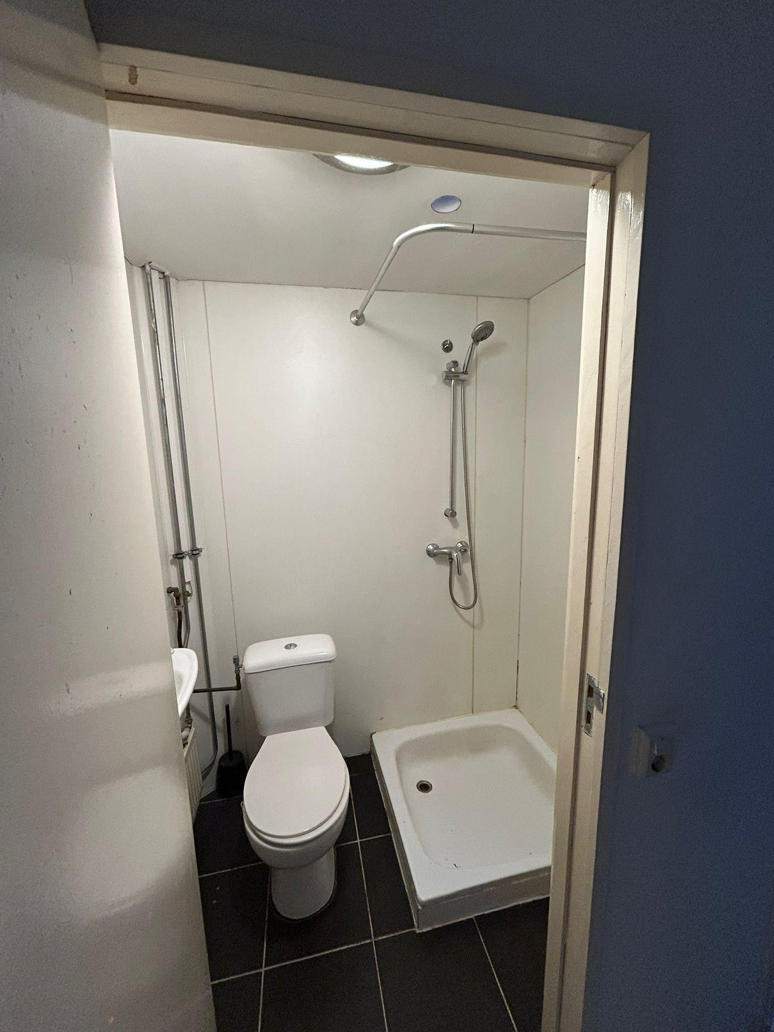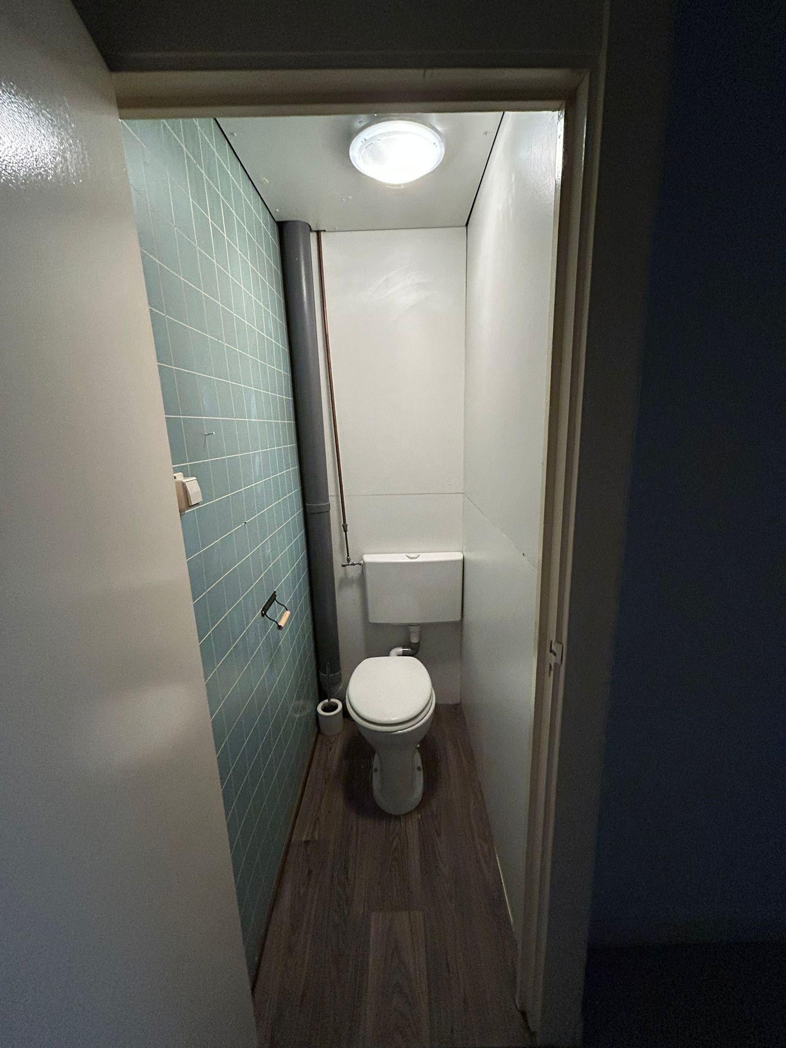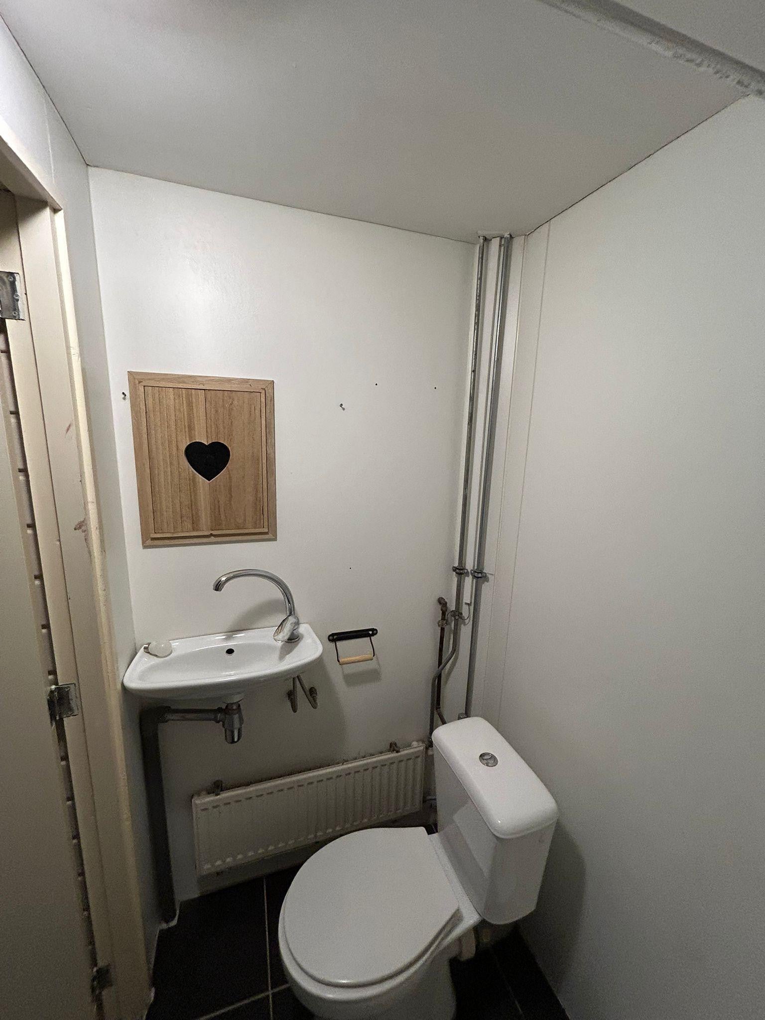 Vanuit de overloop is de compacte badkamer bereikbaar, welke is voorzien van een douche (douchebak met douchegordijn), een tweede toilet en een kleine wastafel.