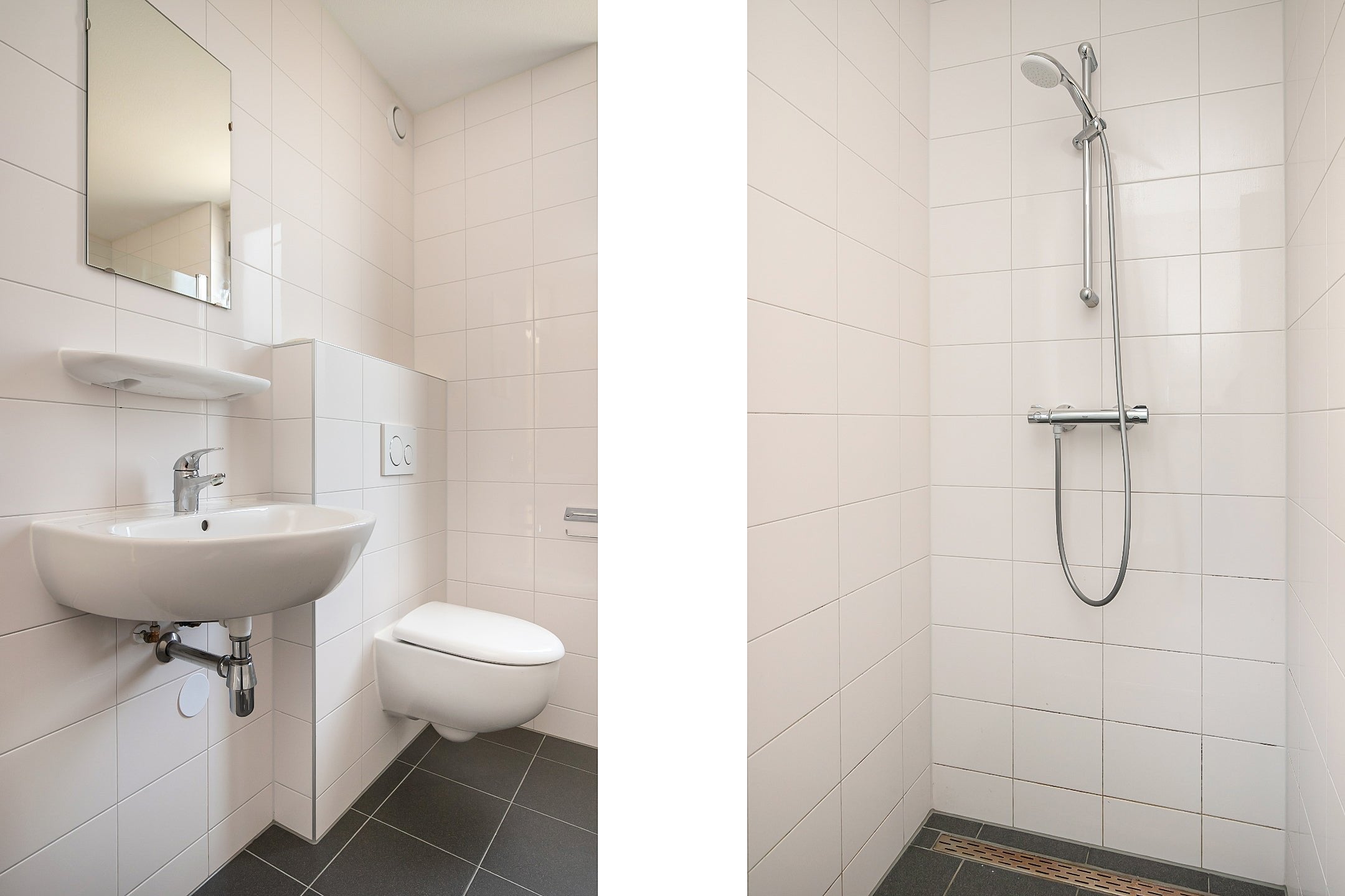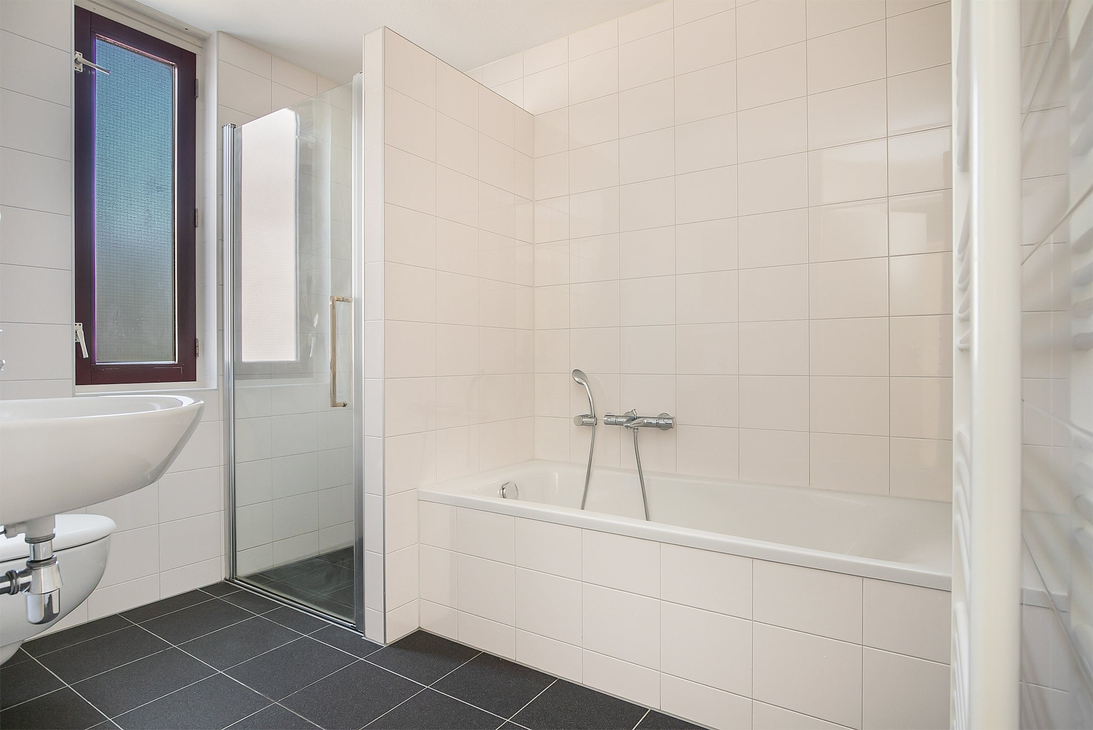 * recent gerenoveerde betegelde badkamer voorzien van een badkamermeubel met enkele wastafel, douche, ligbad, toilet met wandcloset;