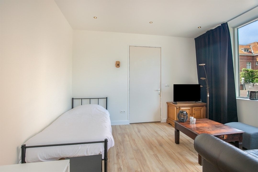 In woon/slaapkamer zijn aanwezig een bankstel, tafel met stoelen, tv met tv-meubel eenpersoonsbed en kledingkast.