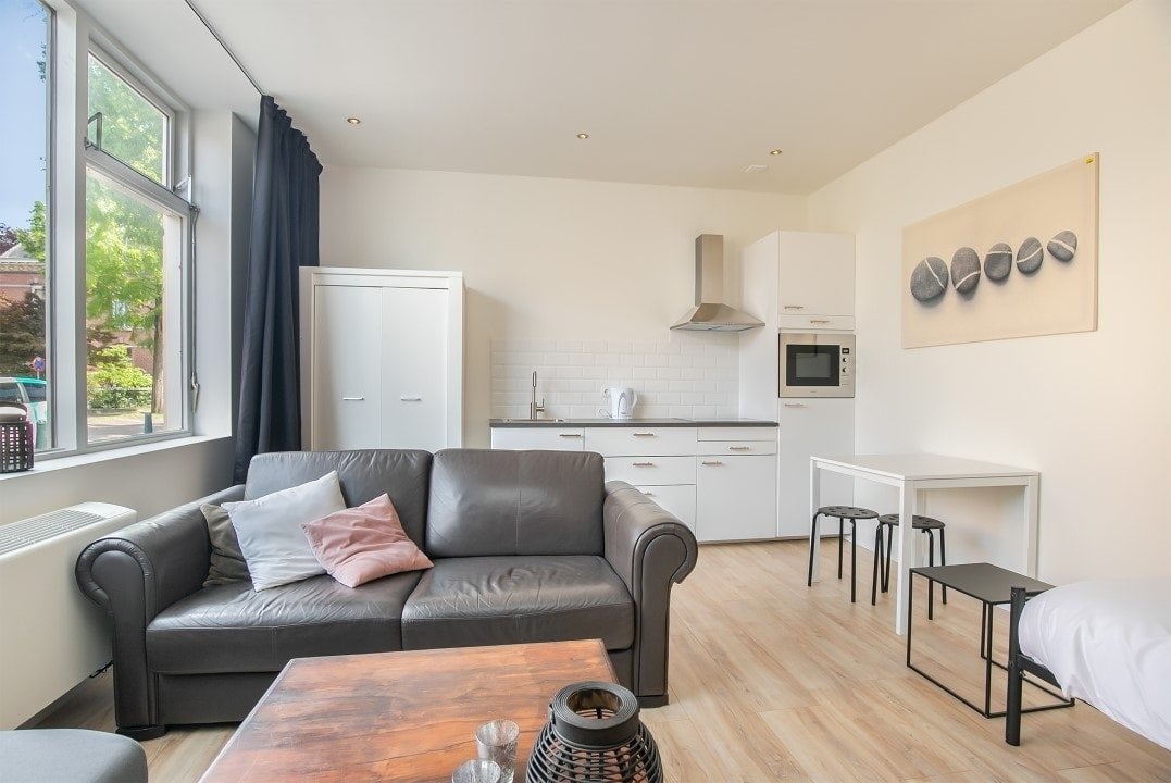 Iedere studio heeft een eigen voordeur met daarachter een woon/slaapkamer en eigen keuken.