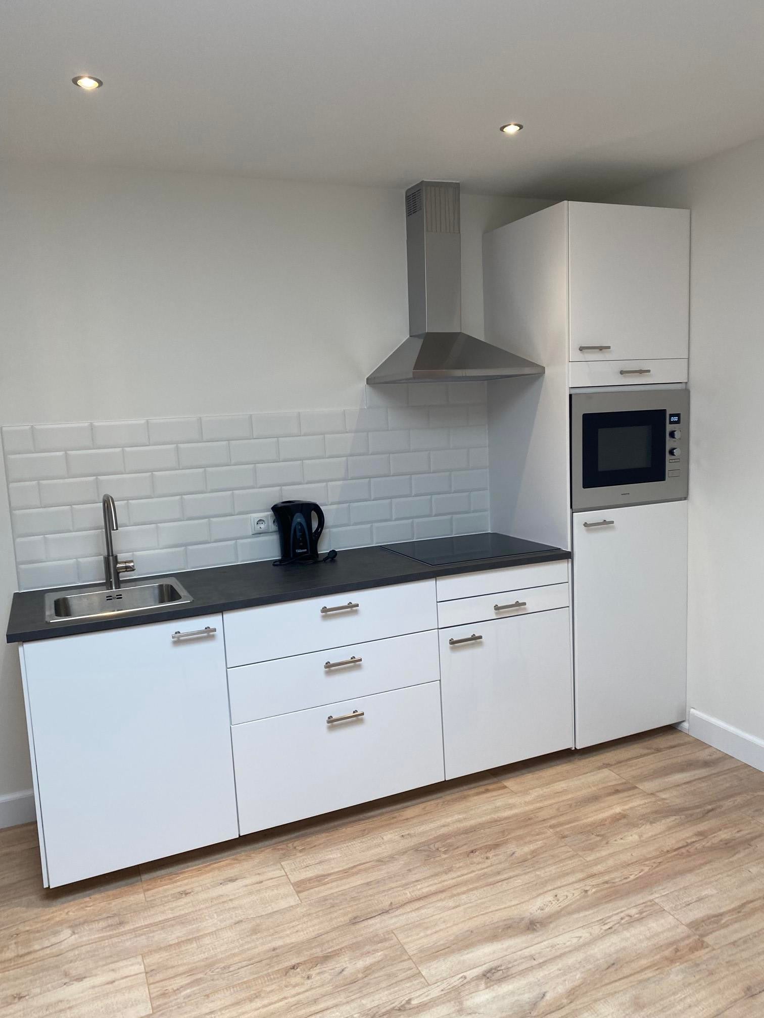 De keuken is voorzien van een koelkast, combimagnetron, inductie gaskookplaat, afzuigunit en spoelbak met mengkraan.