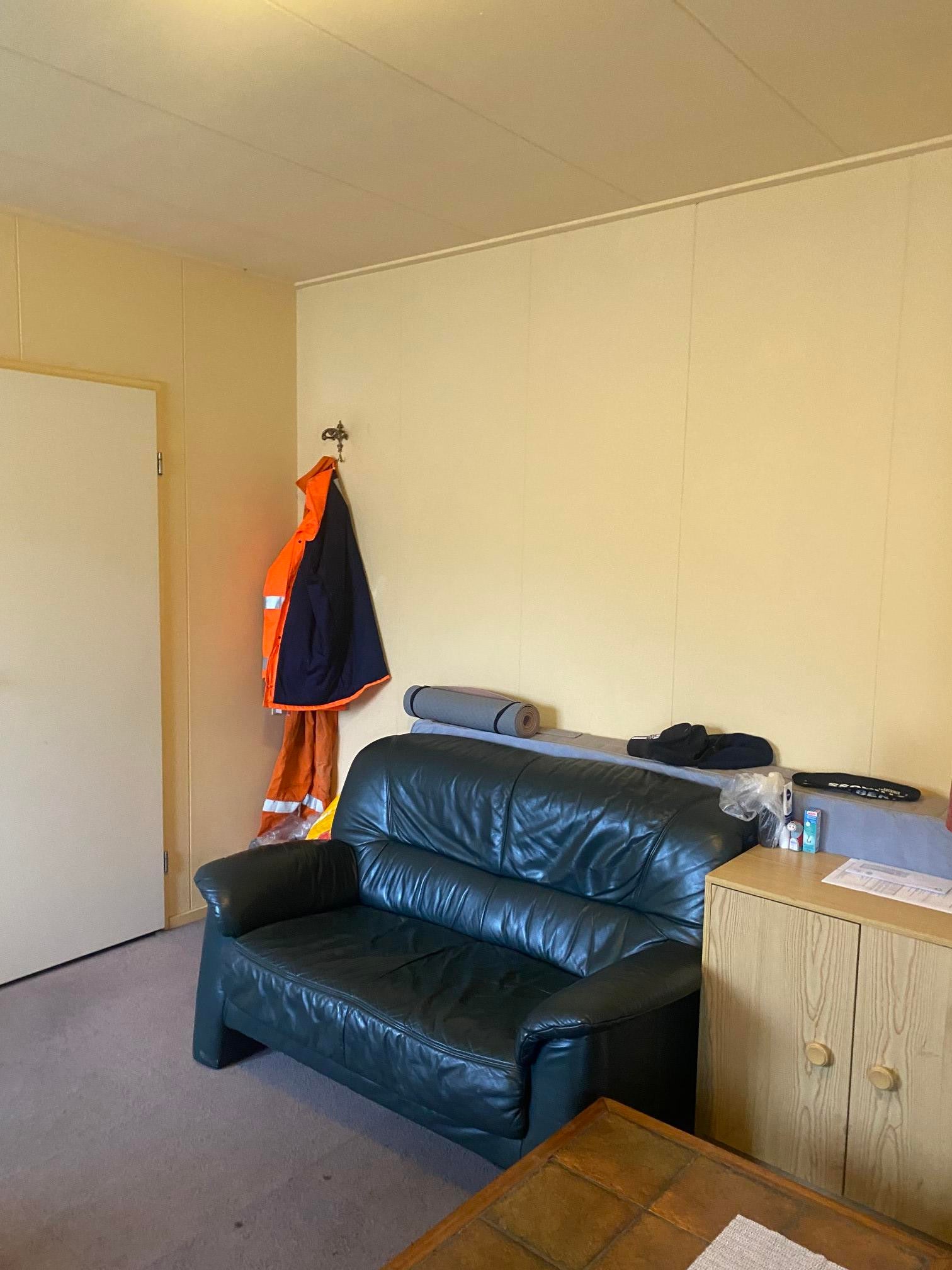In woon/slaapkamer zijn aanwezig een bankstel, tafel met stoelen, tv met tv-meubel eenpersoonsbed en kledingkast.