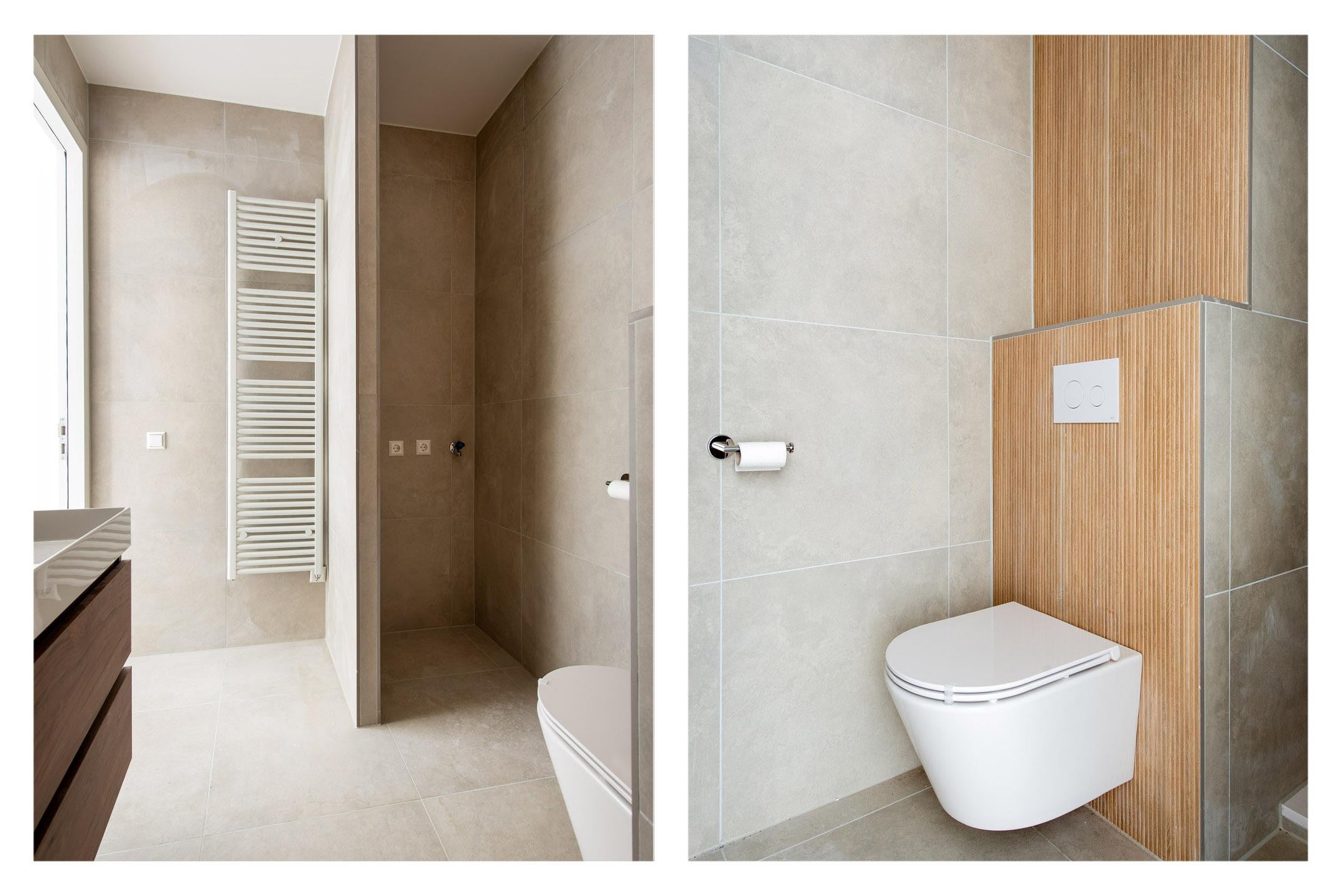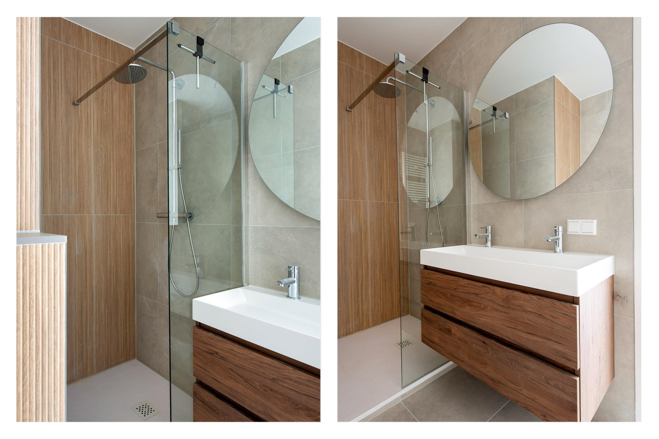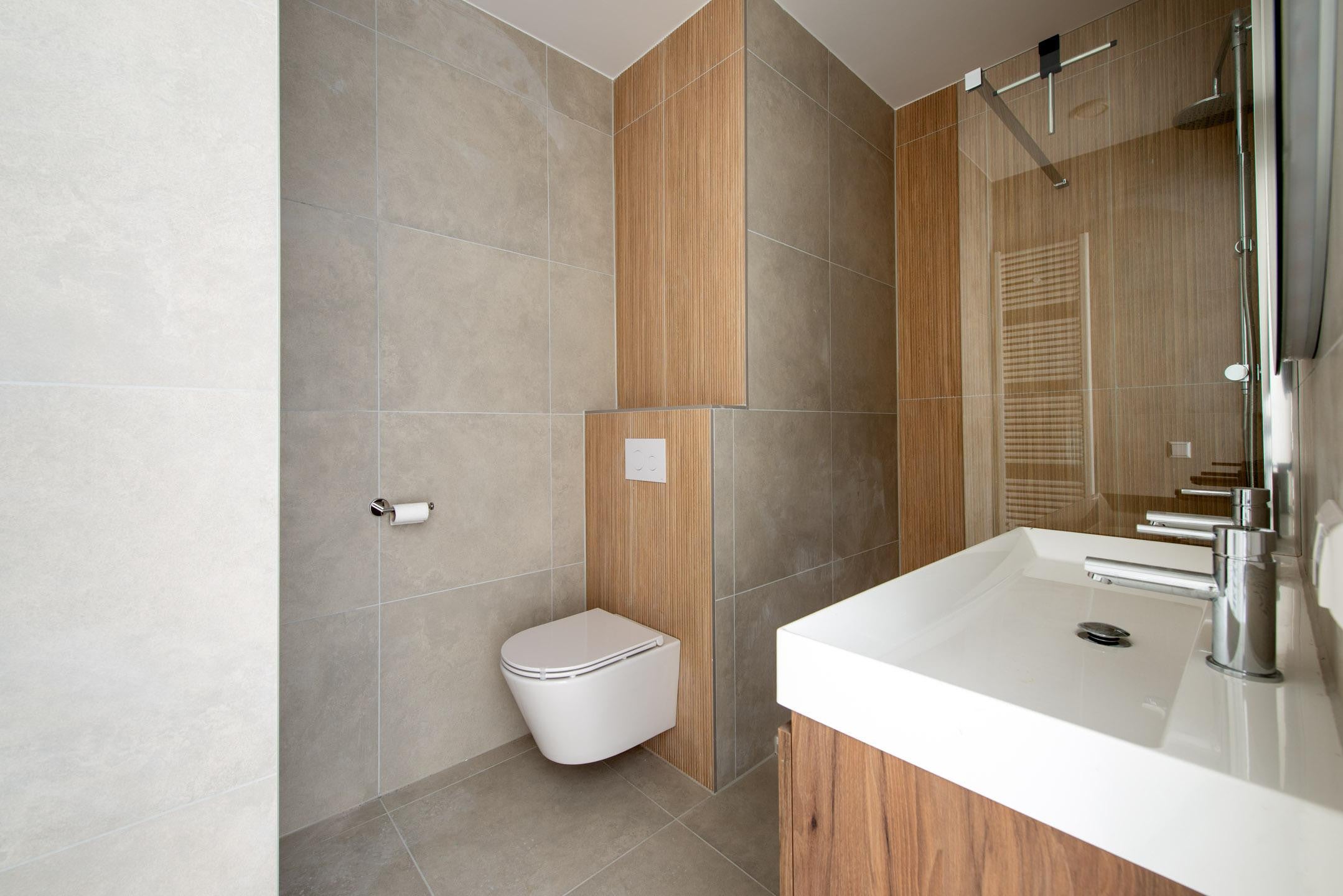 De badkamer is modern afgewerkt en voorzien van een ruime inloopdouche, een tweede toilet en een stijlvol wastafelmeubel. De slimme indeling en hoogwaardige materialen zorgen voor een luxe uitstraling in combinatie met dagelijks comfort.