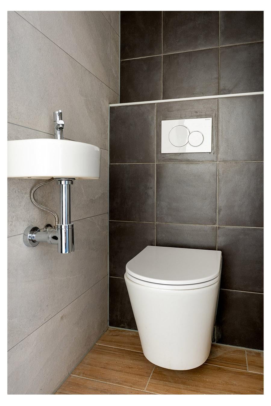 Moderne badkamer met inloopdouche, tweede toilet, handdoekenradiator en wastafelmeubel.