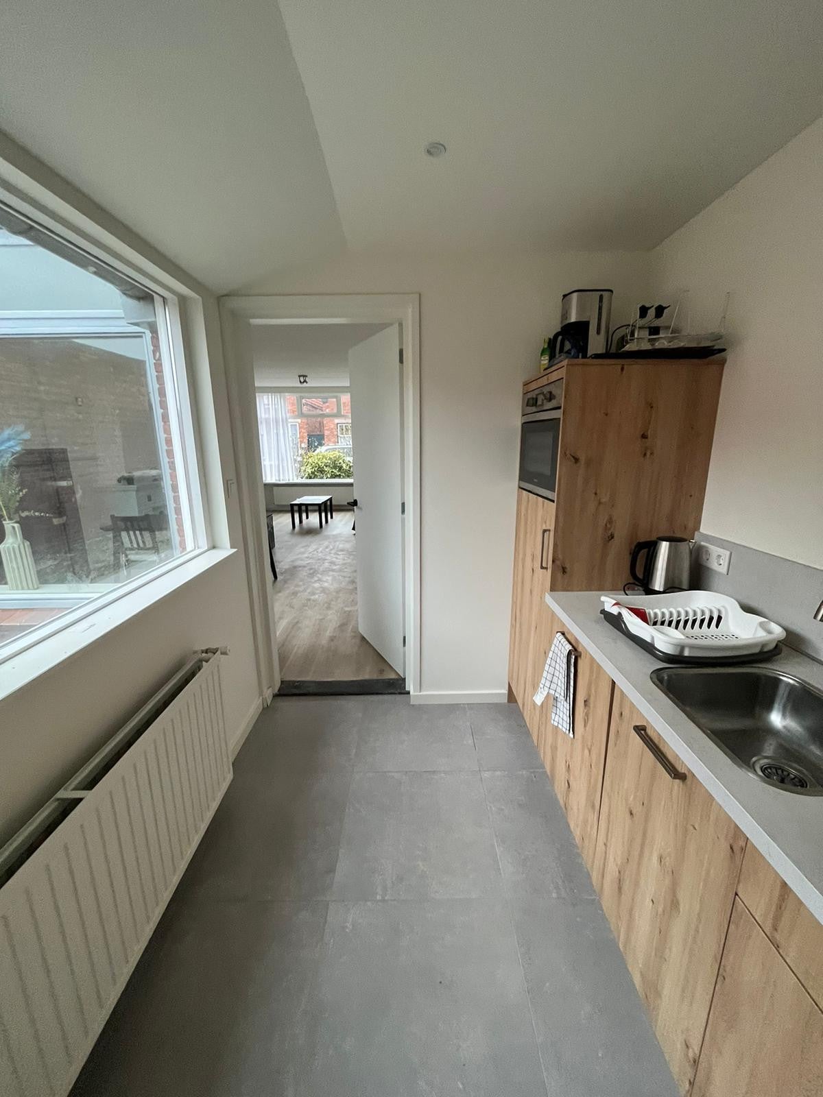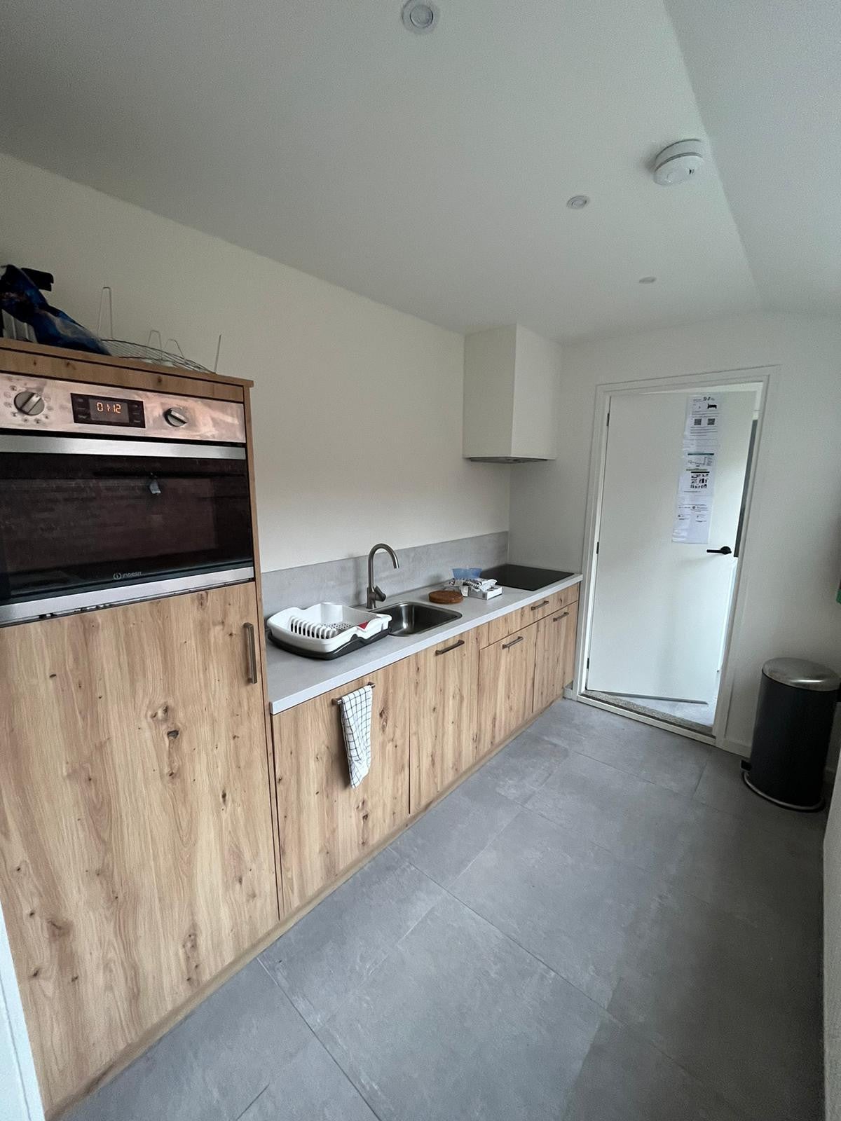 De keuken bevindt zich in een separate ruimte en is eenvoudig ingericht, maar functioneel. Achter de keuken tref je een praktische bijkeuken en de badkamer.