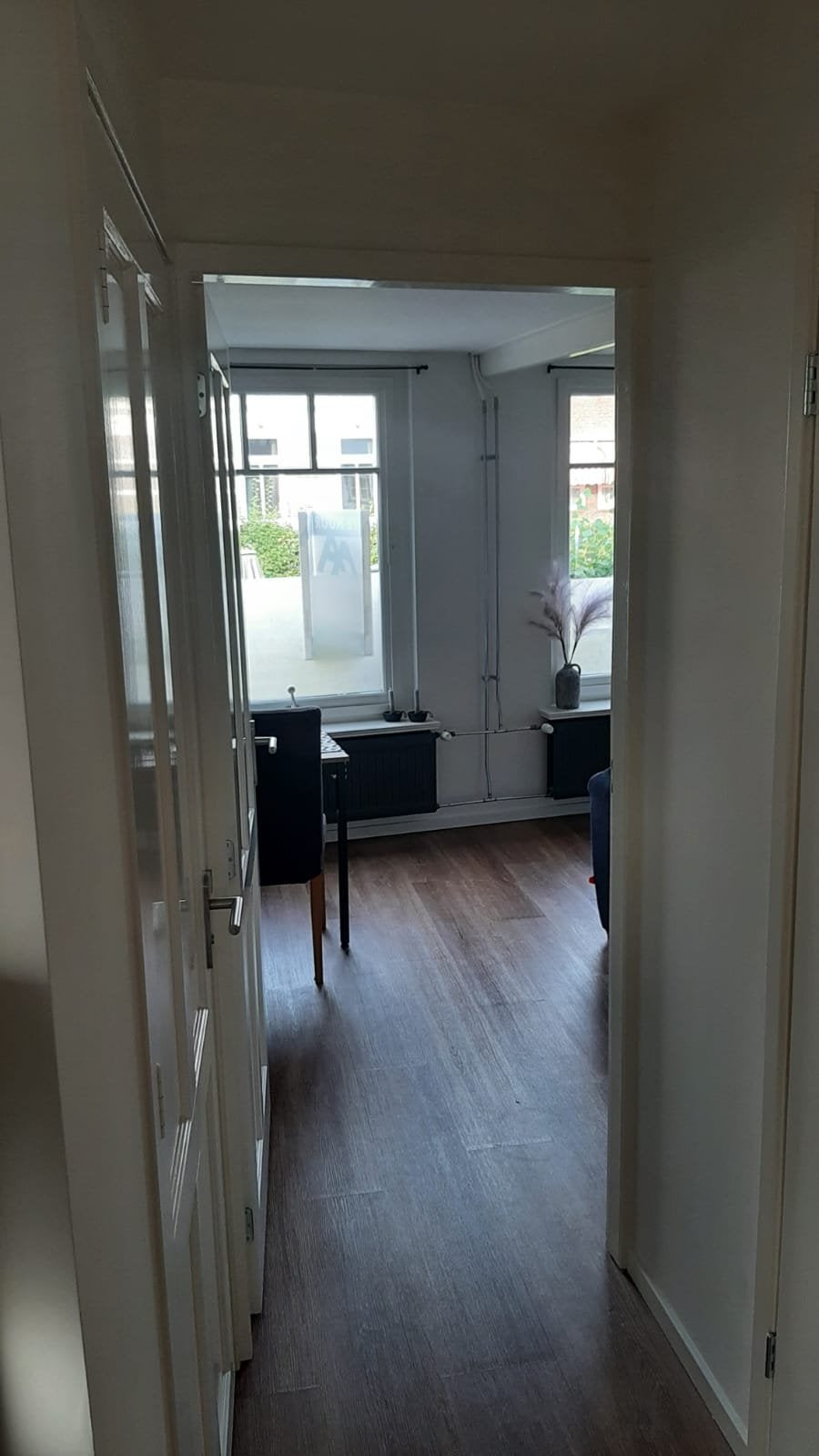Aan de zijkant van de pand vind je de entree van het appartement terug. Hier is een eigen opgang/voordeur. Achter de voordeur is een portaal waar o.a. de trapopgang en een afgesloten ruimte met aansluitingen voor de wasmachine en droger.