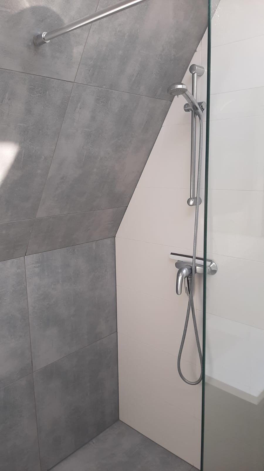 De badkamer is evenals de toiletruime keurig netjes afgewerkt en voorzien van een inloopdouche, wastafel met meubel en een lichtkoepel.