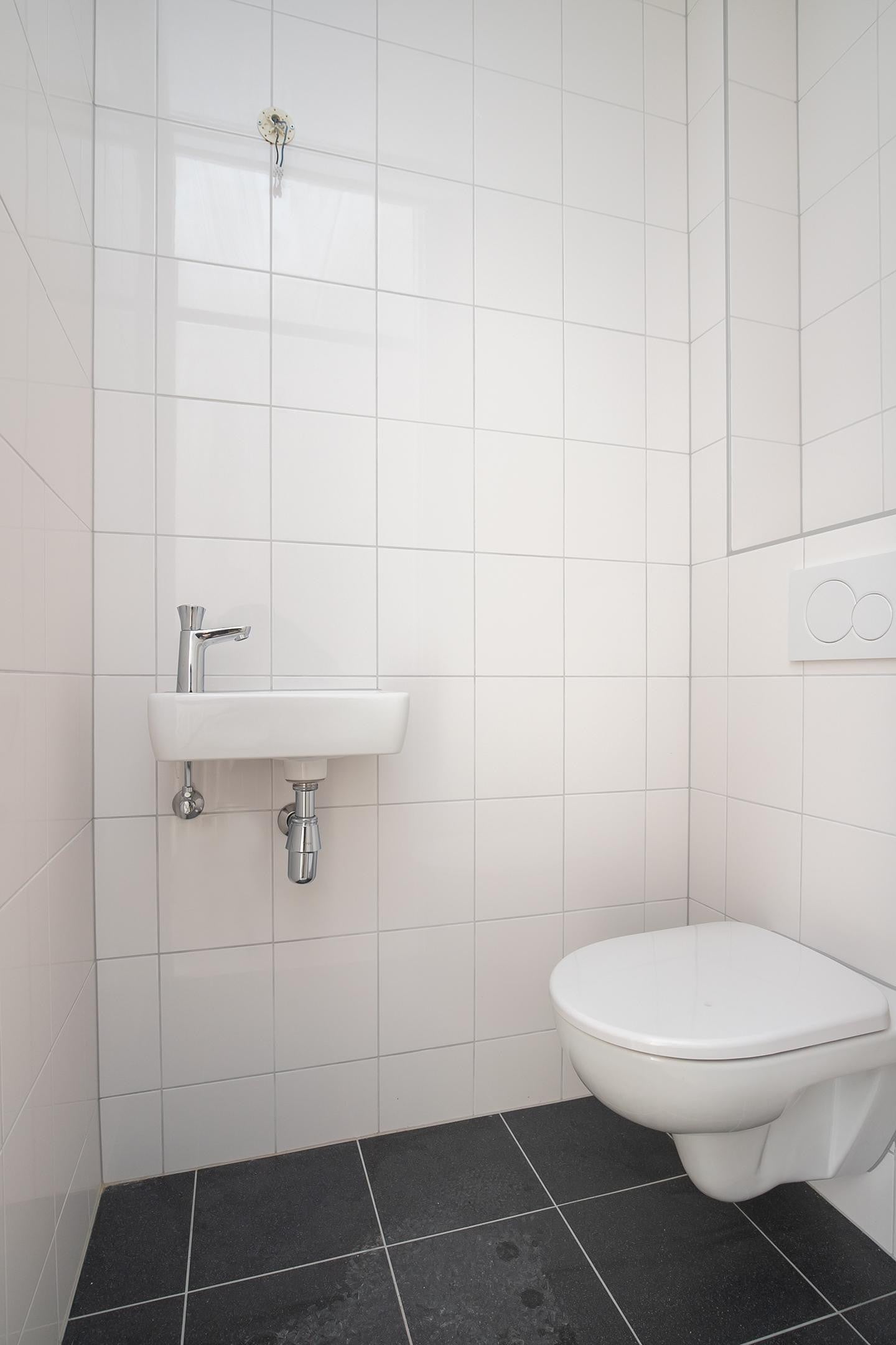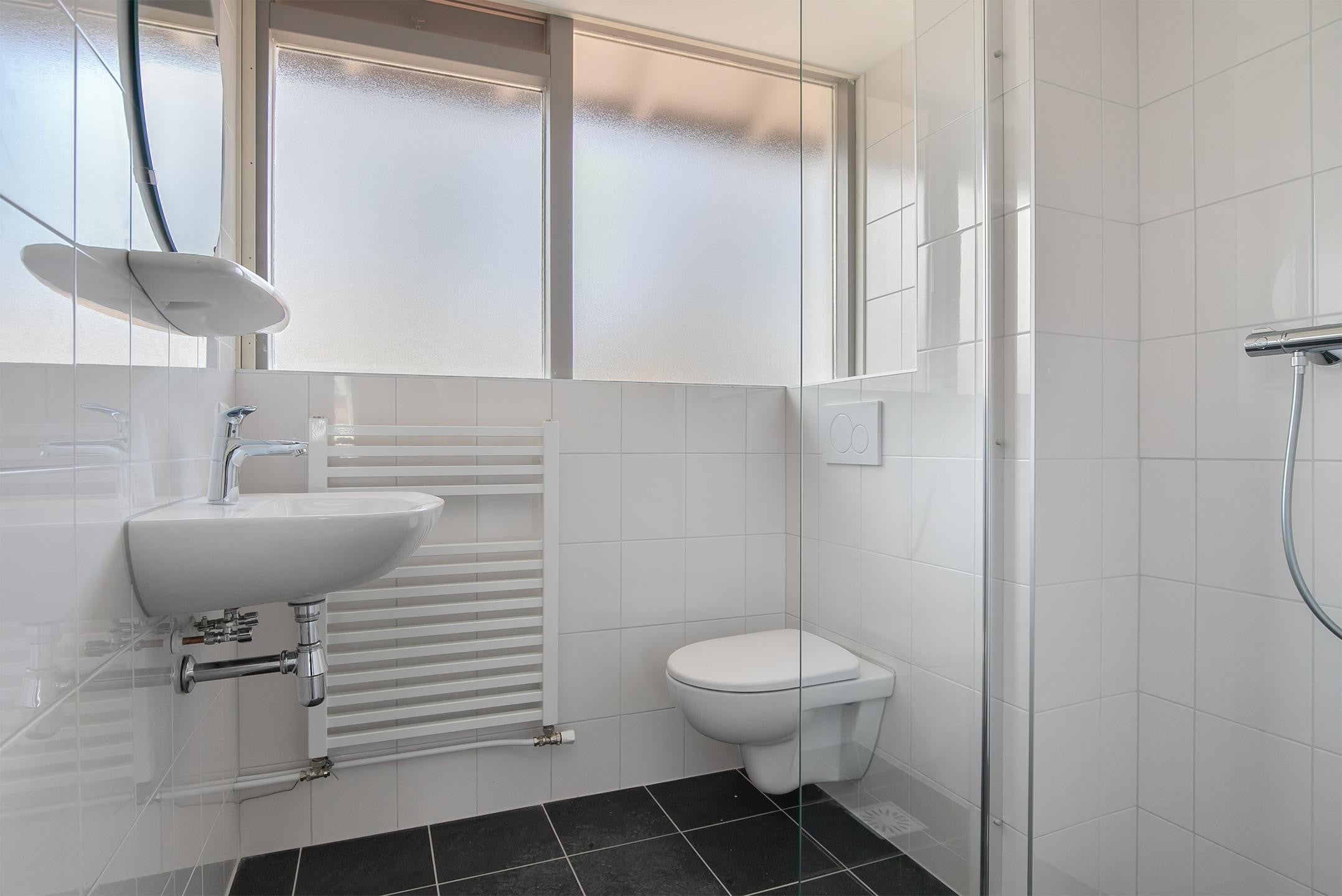 Op de eerste verdieping bevind zich een slaapkamer aan de voorkant van de woning en een slaapkamer aan de achterkant van de woning. Ook is er hier een badkamer voorzien van een enkele wastafel, douche cabine, en toilet.
