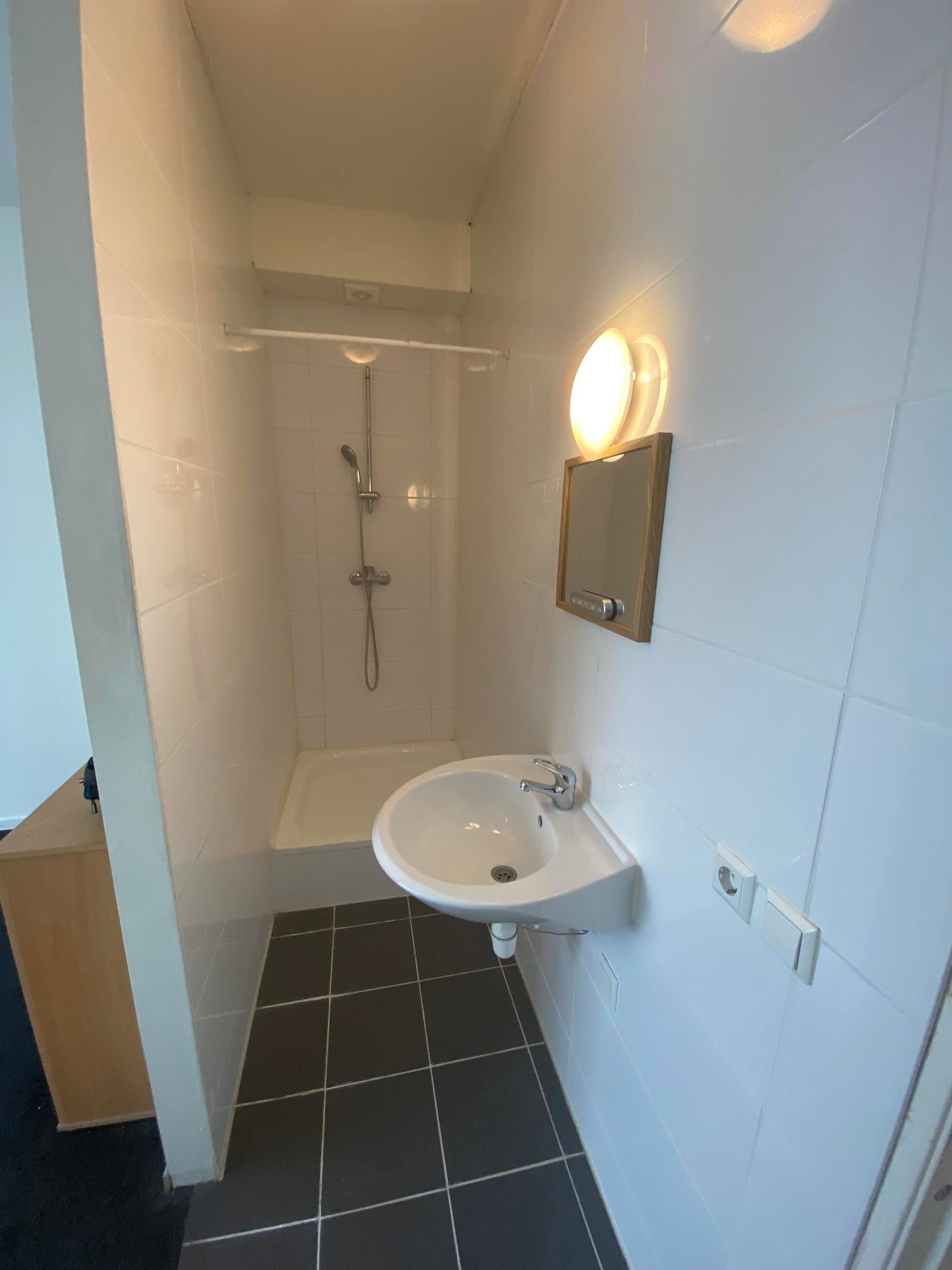 Ook de slaapkamer is v.v. een groot raamkozijn met "Frans balkon" wat ook weer zorgt voor veel licht inval. De badkamer heeft vanuit de slaapkamer een open toegang en is v.v. een wastafel en douche.