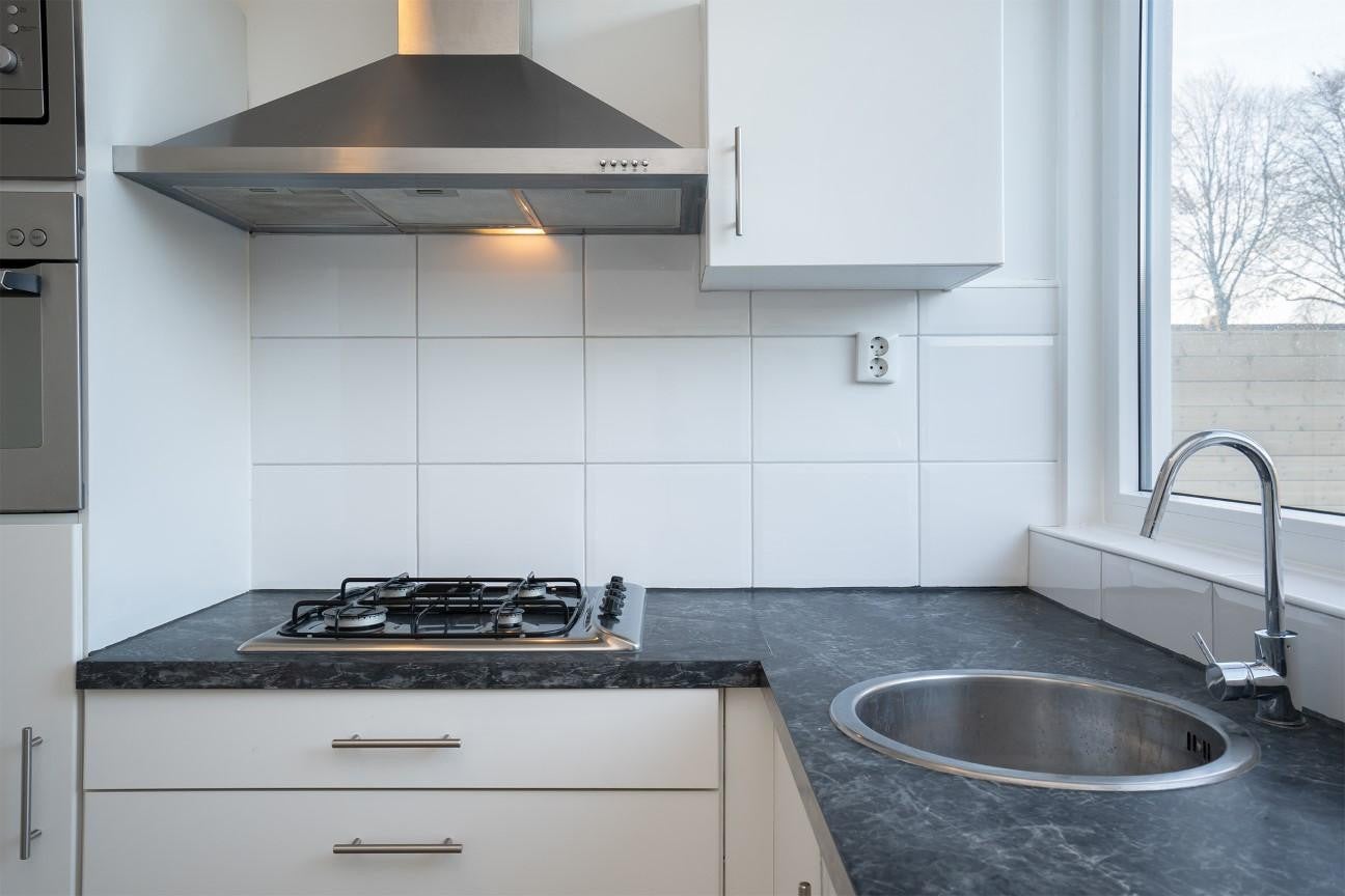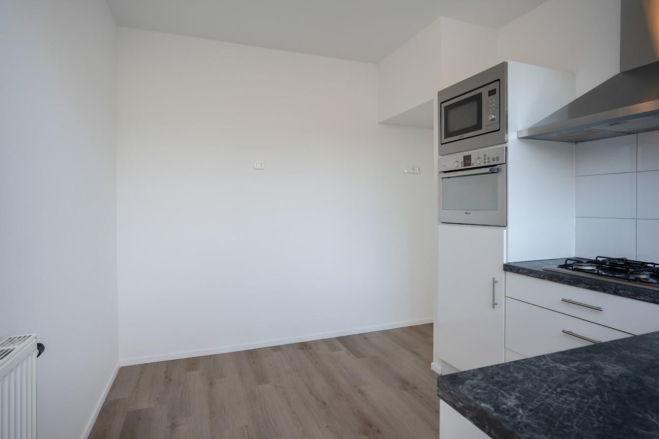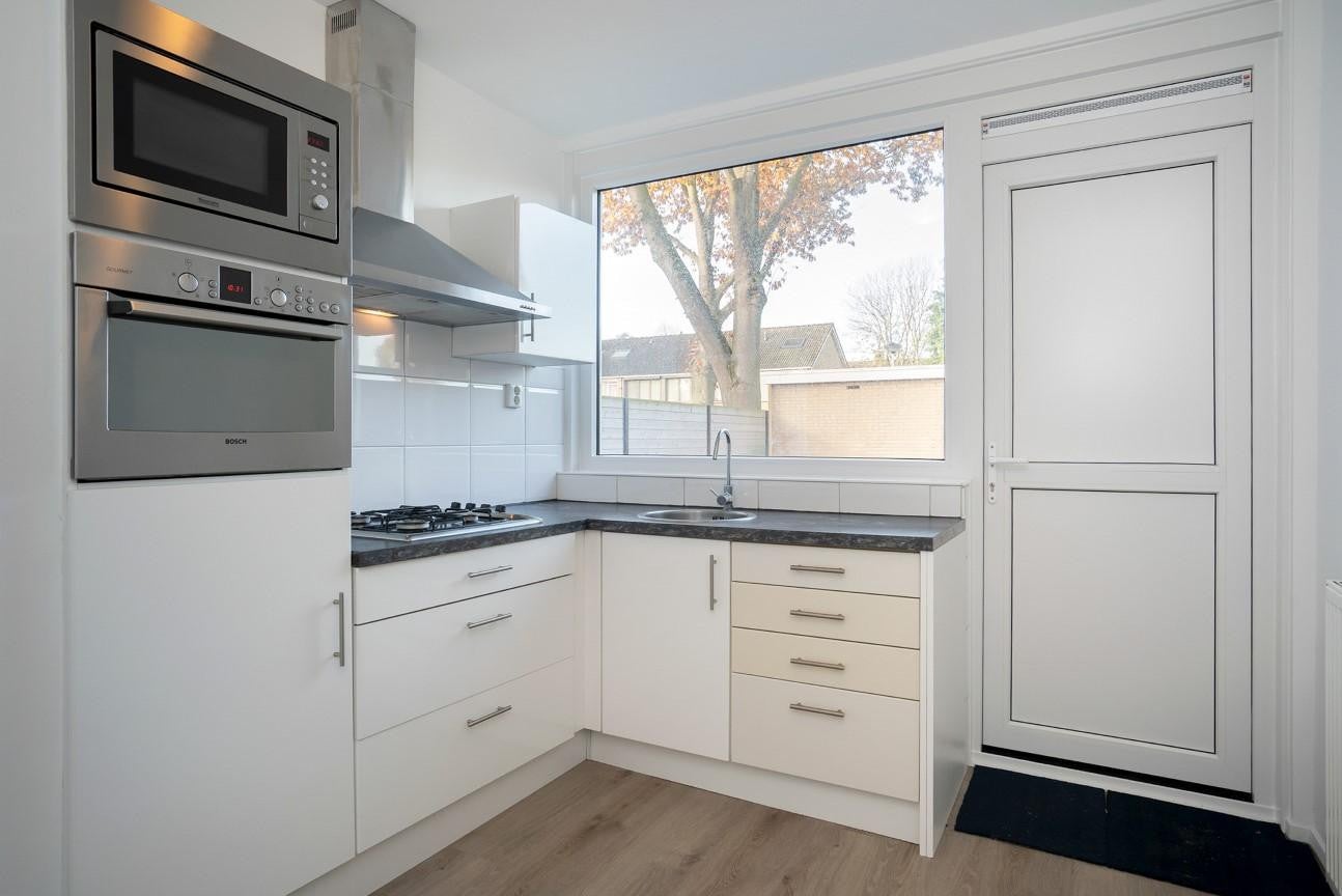 De keuken (circa 9 m²) aan de achterzijde van de woning heeft een pvc-vloer en gedeeltelijk betegelde, gedeeltelijk stucwerk wanden en stucwerk plafond. De keukeninrichting in hoekopstelling heeft een kunststof aanrechtblad en is voorzien van een spoelbak, 4-pits gaskookplaat, RVS afzuigkap, combi-oven, magnetron, en koelkast.