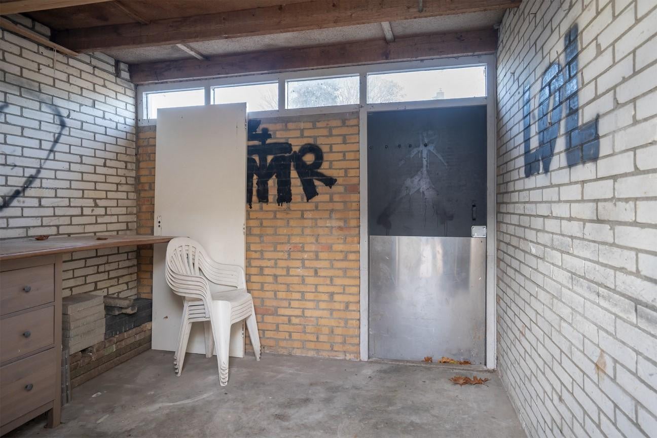De berging (circa 4 m²) heeft een betonnen vloer, stucwerk wanden en de dakconstructie in het zicht. In de berging is de Cv-installatie opgesteld.