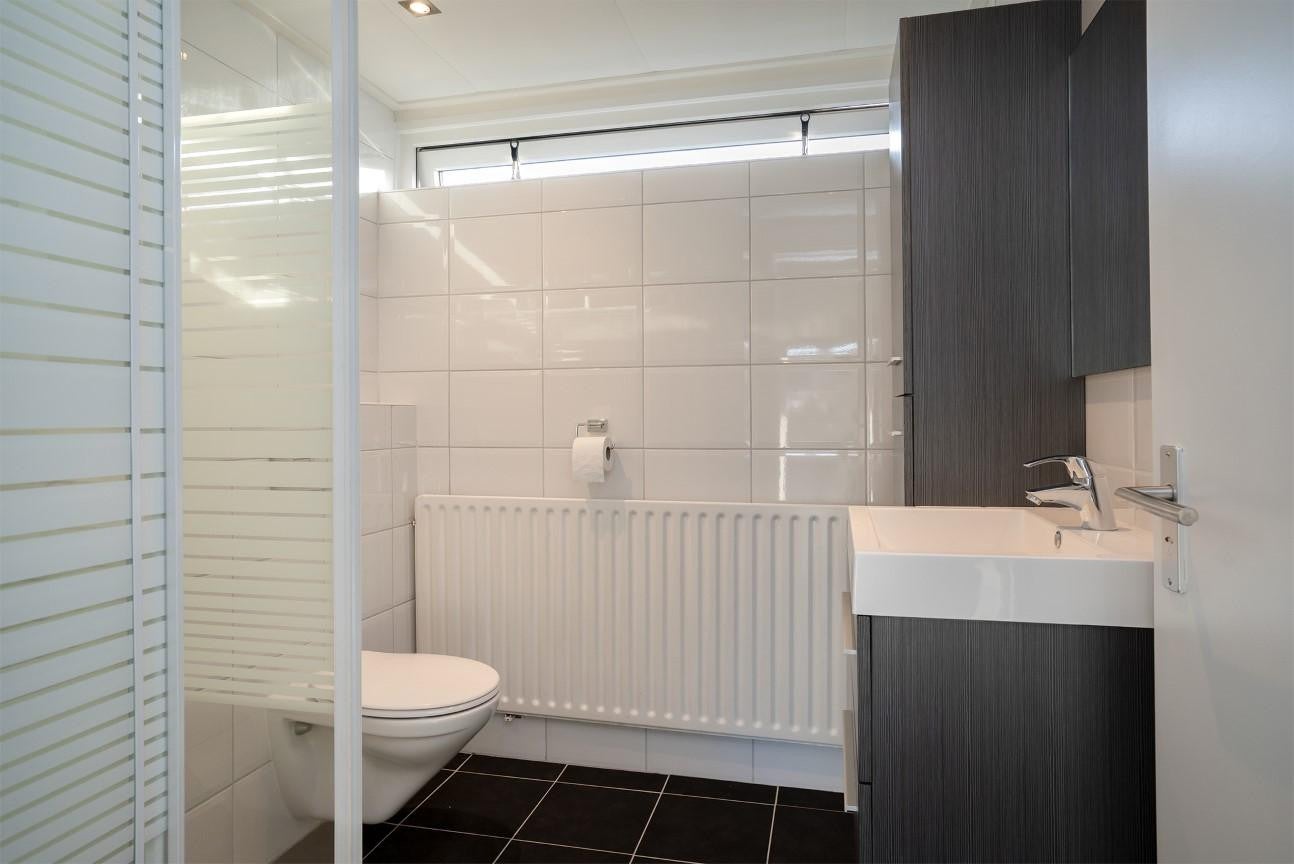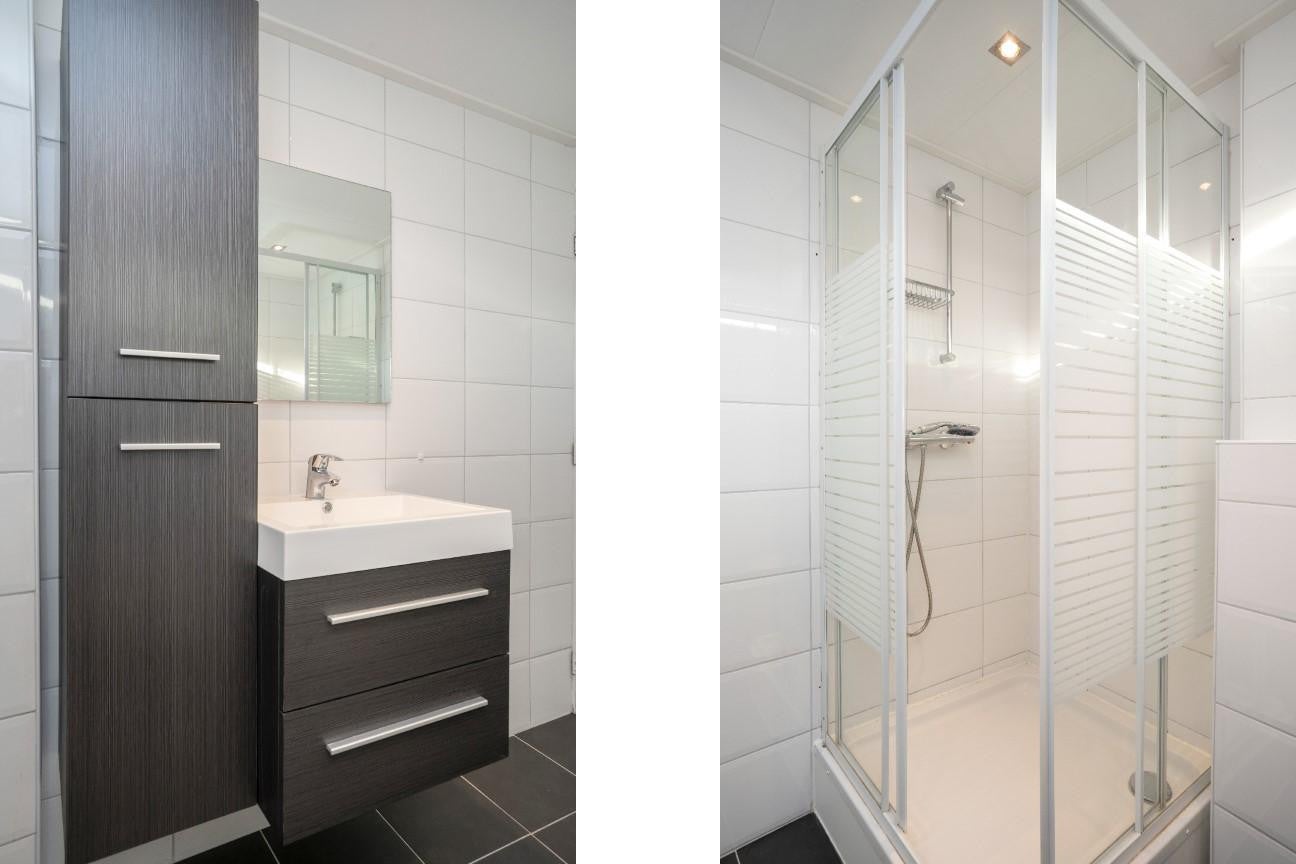De nieuwe badkamer (ruim 4 m²) heeft een tegelvloer, betegelde wanden en gipsplaten plafond met spotlights en is ingericht met een badkamermeubel met wastafel, douchecabine en hangtoilet.