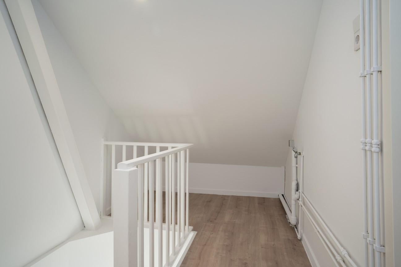 Overloop met laminaat vloer, stucwerk wanden en de dakconstructie in het zicht. Op de overloop zijn de aansluitingen voor de wasmachine en droger aanwezig. De overloop biedt toegang tot de berging en de vierde slaapkamer.