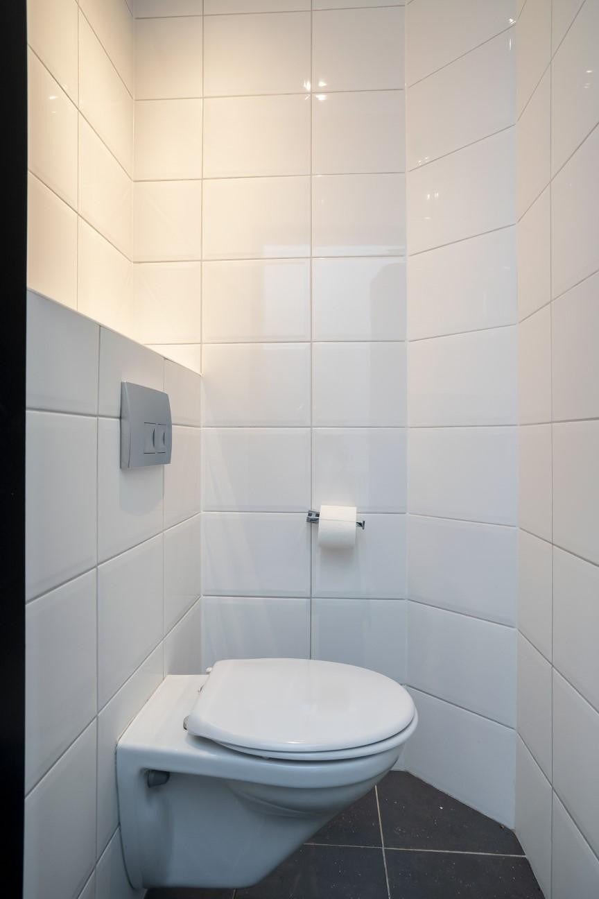 De toiletruimte heeft een tegelvloer, betegelde wanden en stucwerk plafond met spotlight en is ingericht met een hangtoilet.