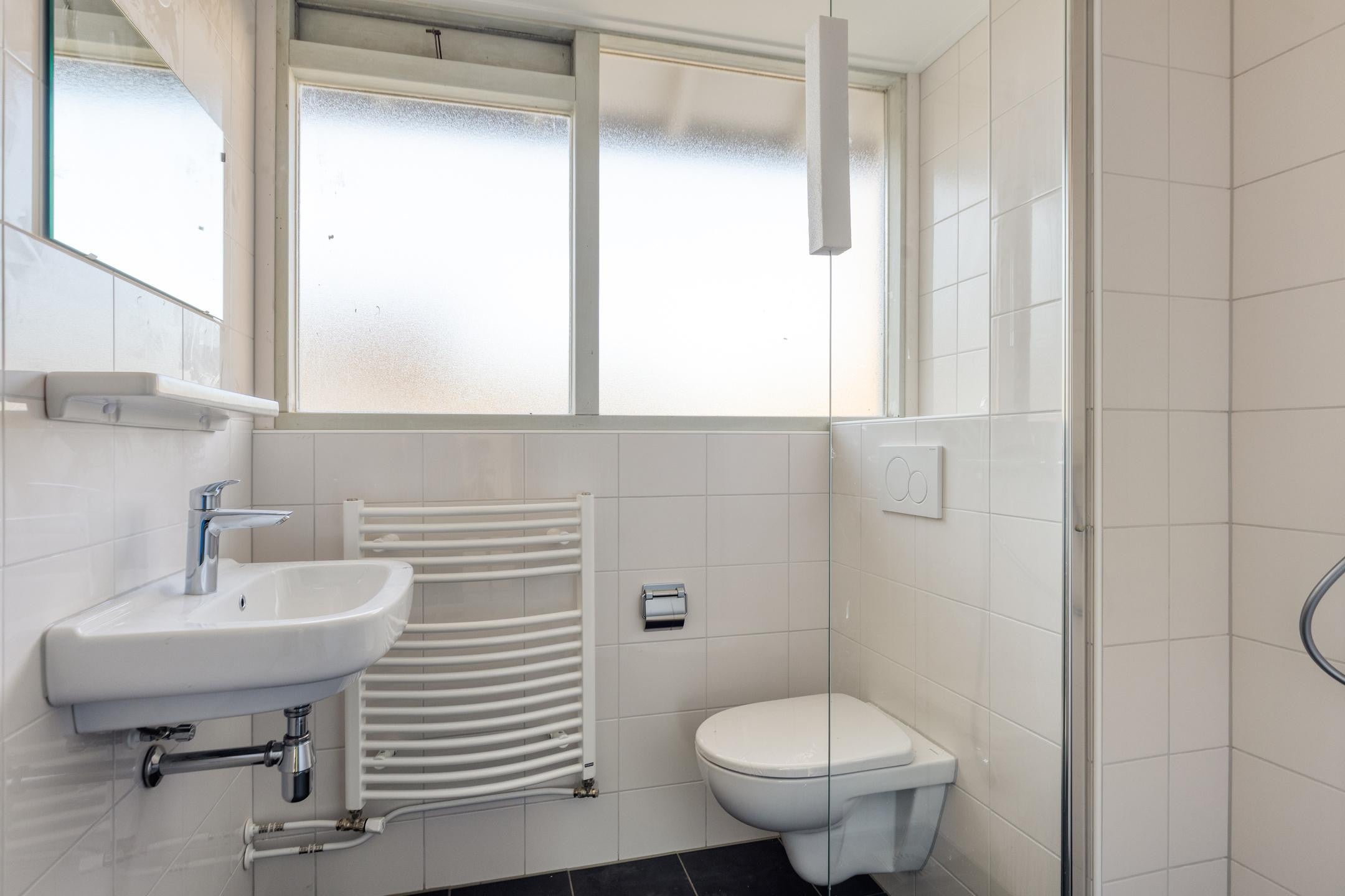De badkamer is evenals de toiletruimte keurig afgewerkt. Een douche, 2e toilet, handdoekenradiator en wasmeubel met daarboven een spiegel. De badkamer is nagenoeg volledig betegeld.
