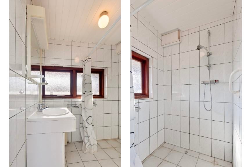 De badkamer heeft een eenvoudig uitstraling maar is vooral functioneel te noemen. Een open doucheruimte en een wastafel inclusief meubel.