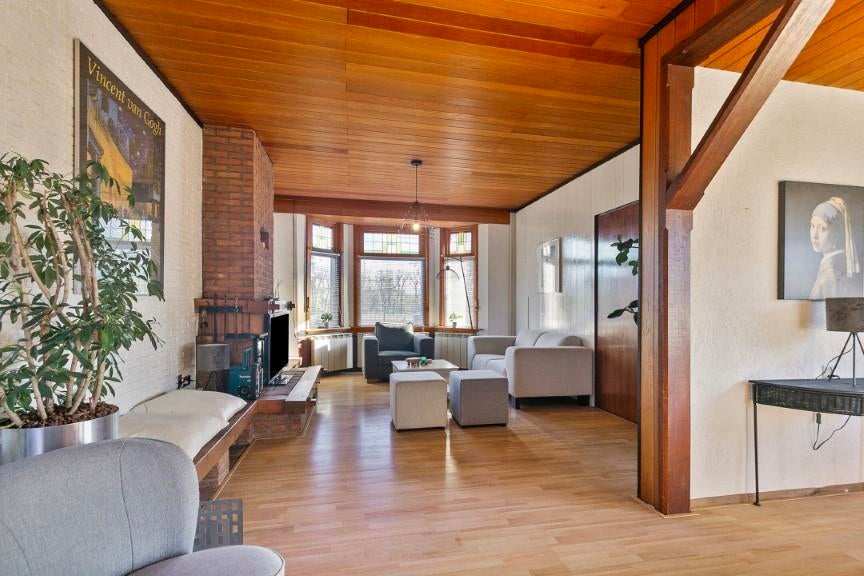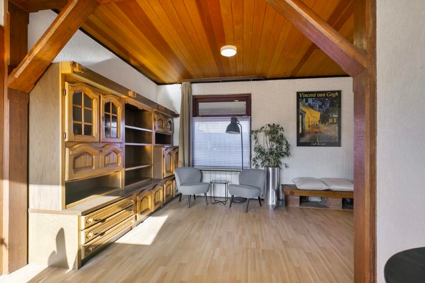 Ruime L-vormige kamer voorzien van een erker, ouderwetse schouw, rolluiken, kelderkast en toegang richting de keuken. De woonkamer is circa 34 m2.