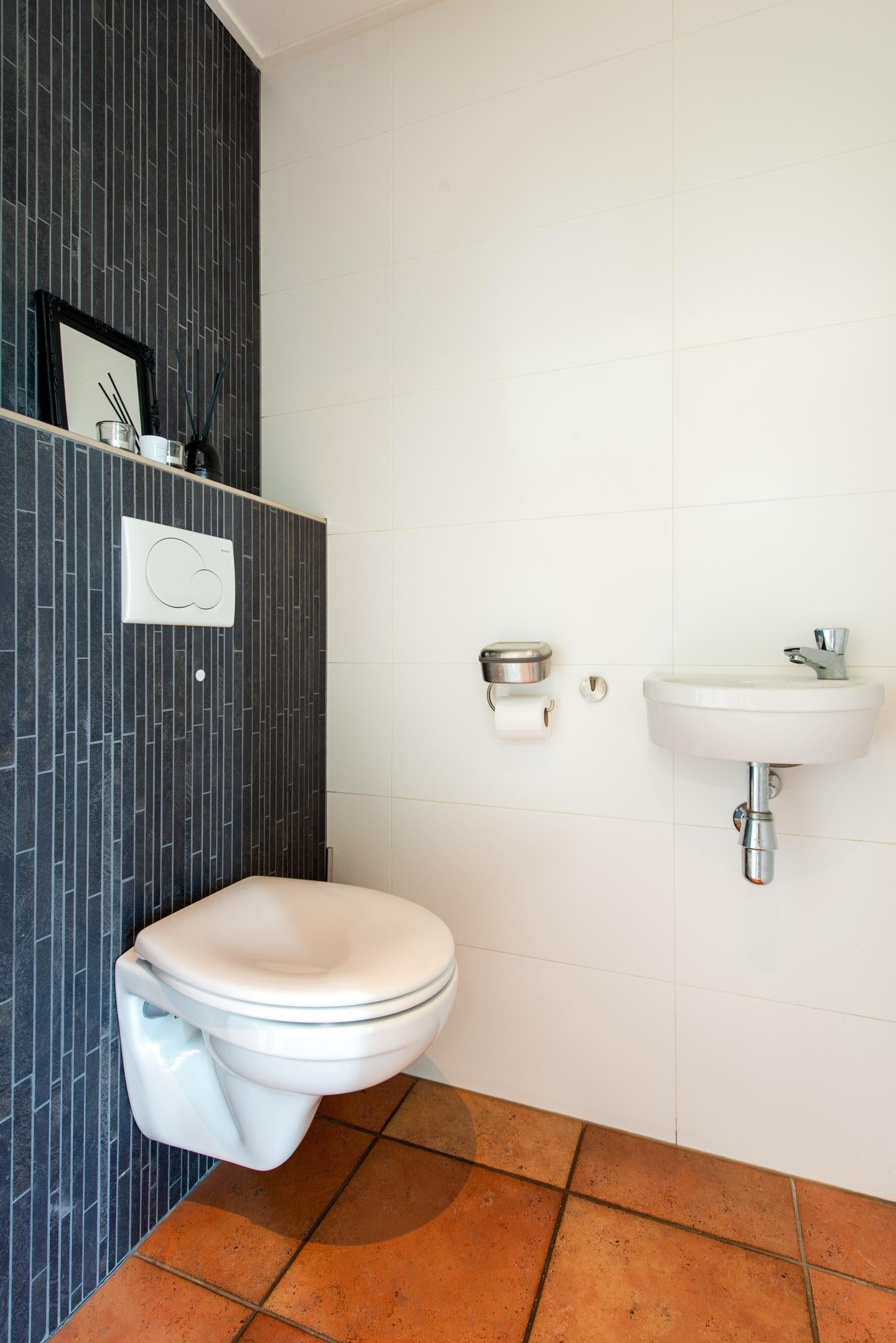 Het toilet (zwevend) beschikt over een fonteintje en mechanische ventilatie. Het plafond is voorzien van spuitwerk. De wanden zijn geheel betegeld.