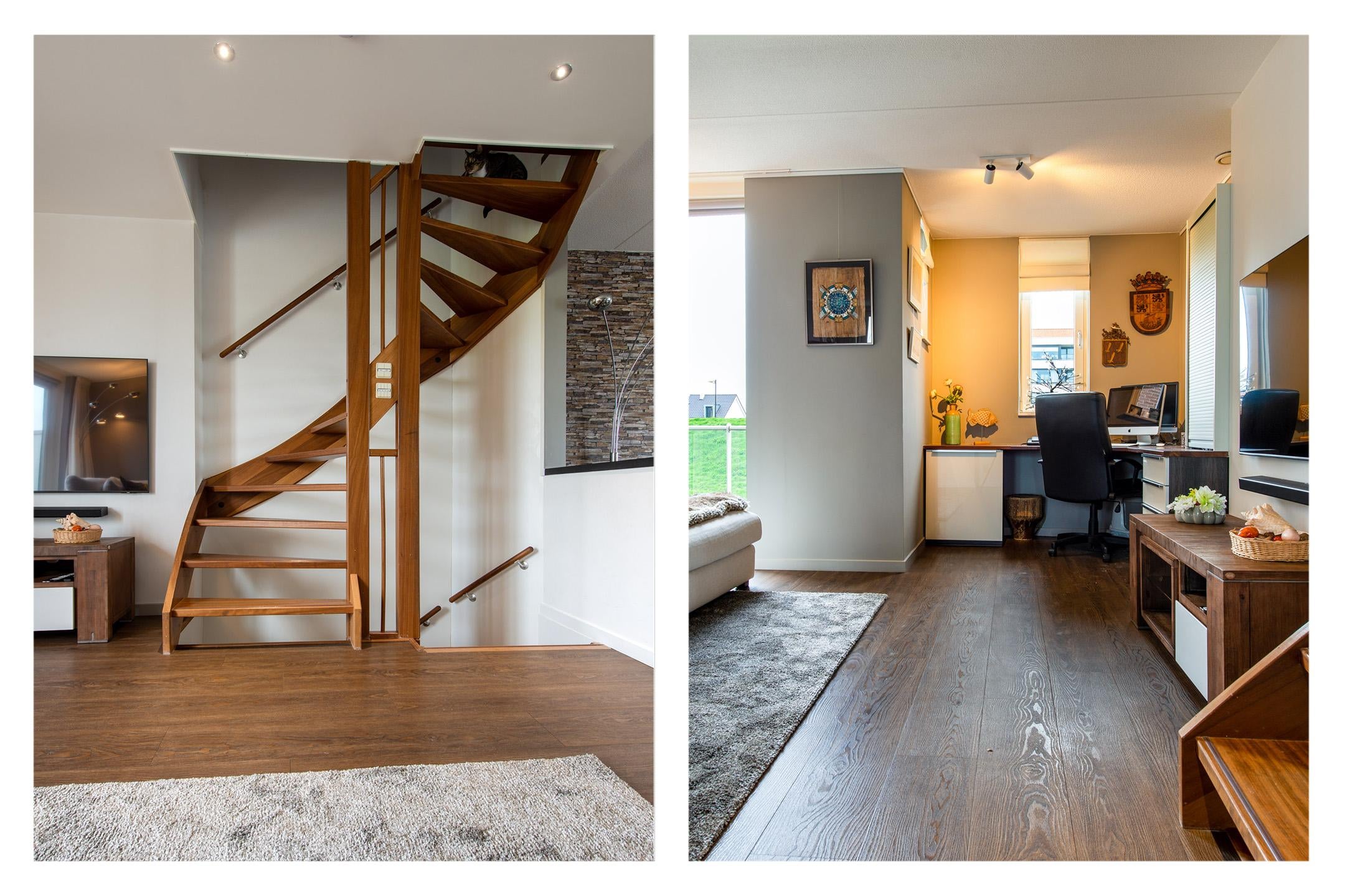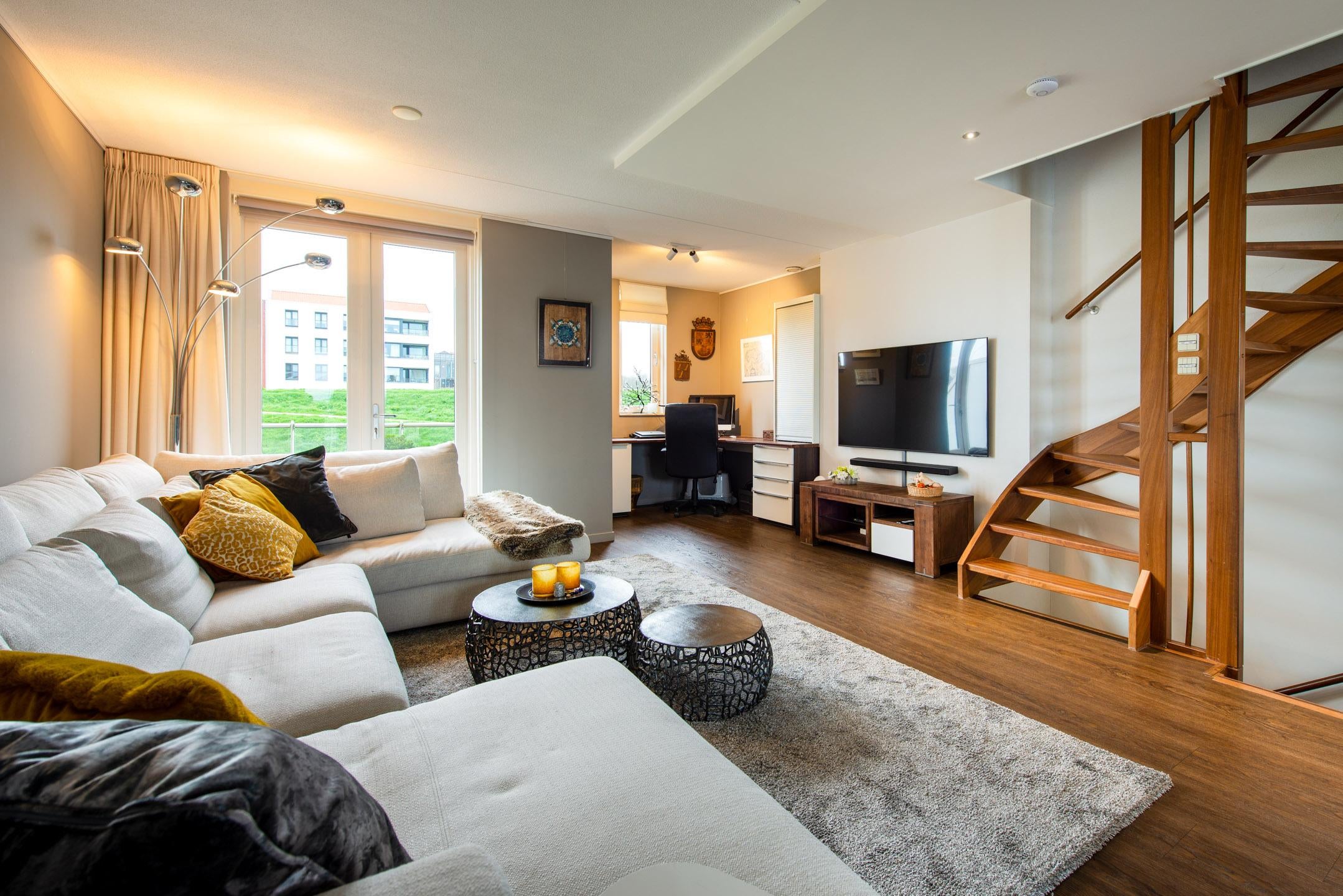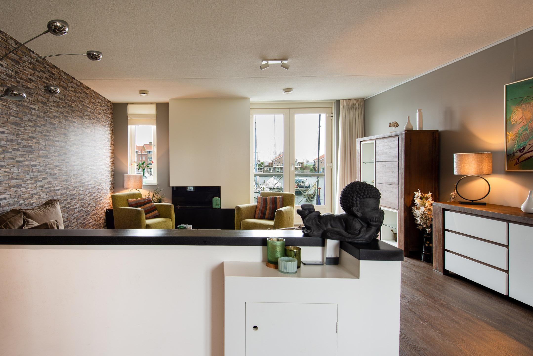 De prachtige en sfeervolle woonkamer over gehele lengte van de woning. De woonkamer heeft een ruime zithoek met sfeervolle gelhaard (bio-ethanol) en prachtig uitzicht over het water, een aparte zithoek aan de voorzijde met tv-aansluiting en een werkplek voorzien met bureauopstelling. De tweede verdieping is met een vaste trap bereikbaar.