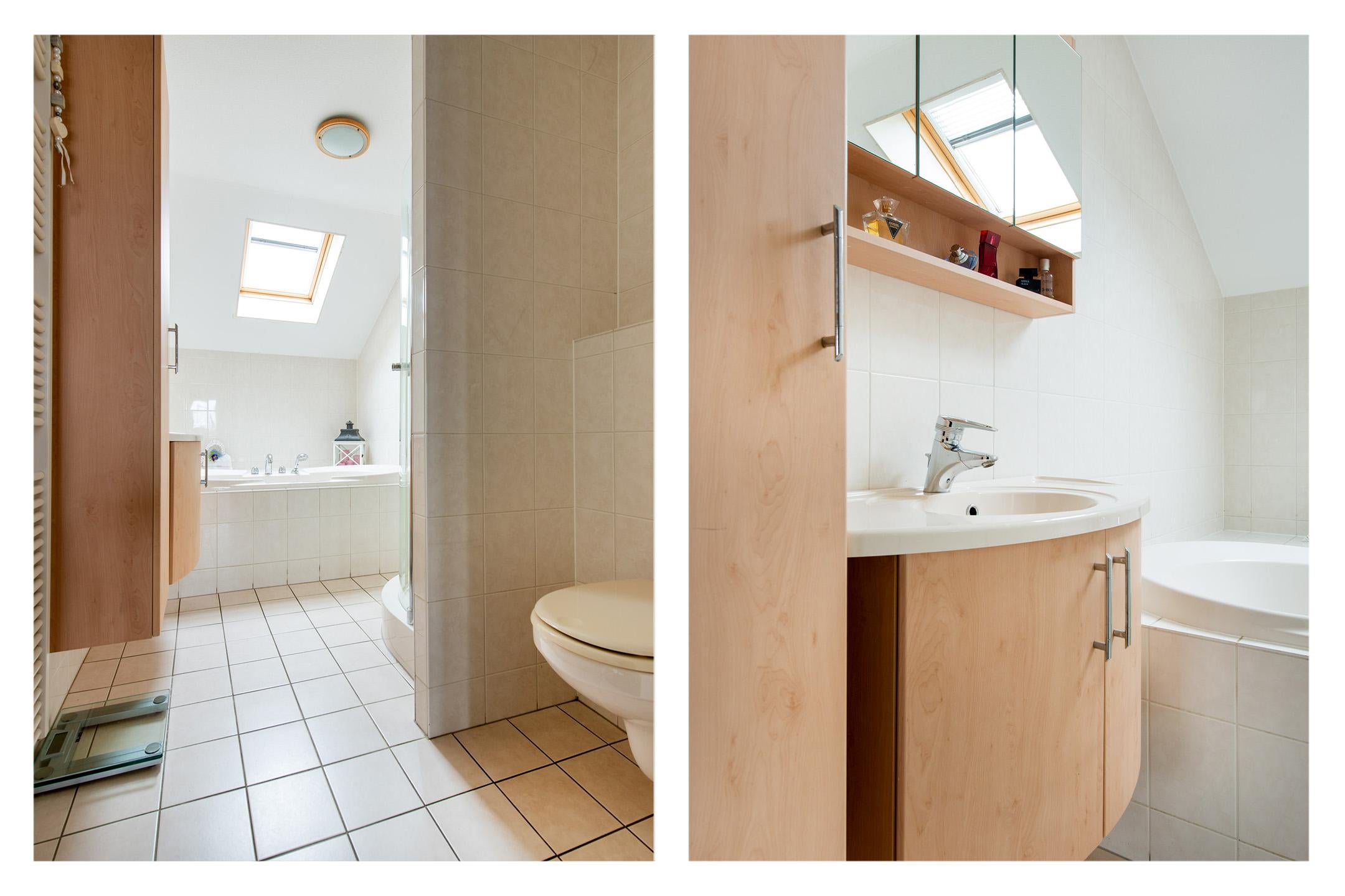Deze royale badkamer beschikt over een groot ligbad, douche, 2e toilet, en wastafel inclusief meubel. De badkamer is volledig betegeld en voorzien van een velux dakraam en mechanische ventilatie.