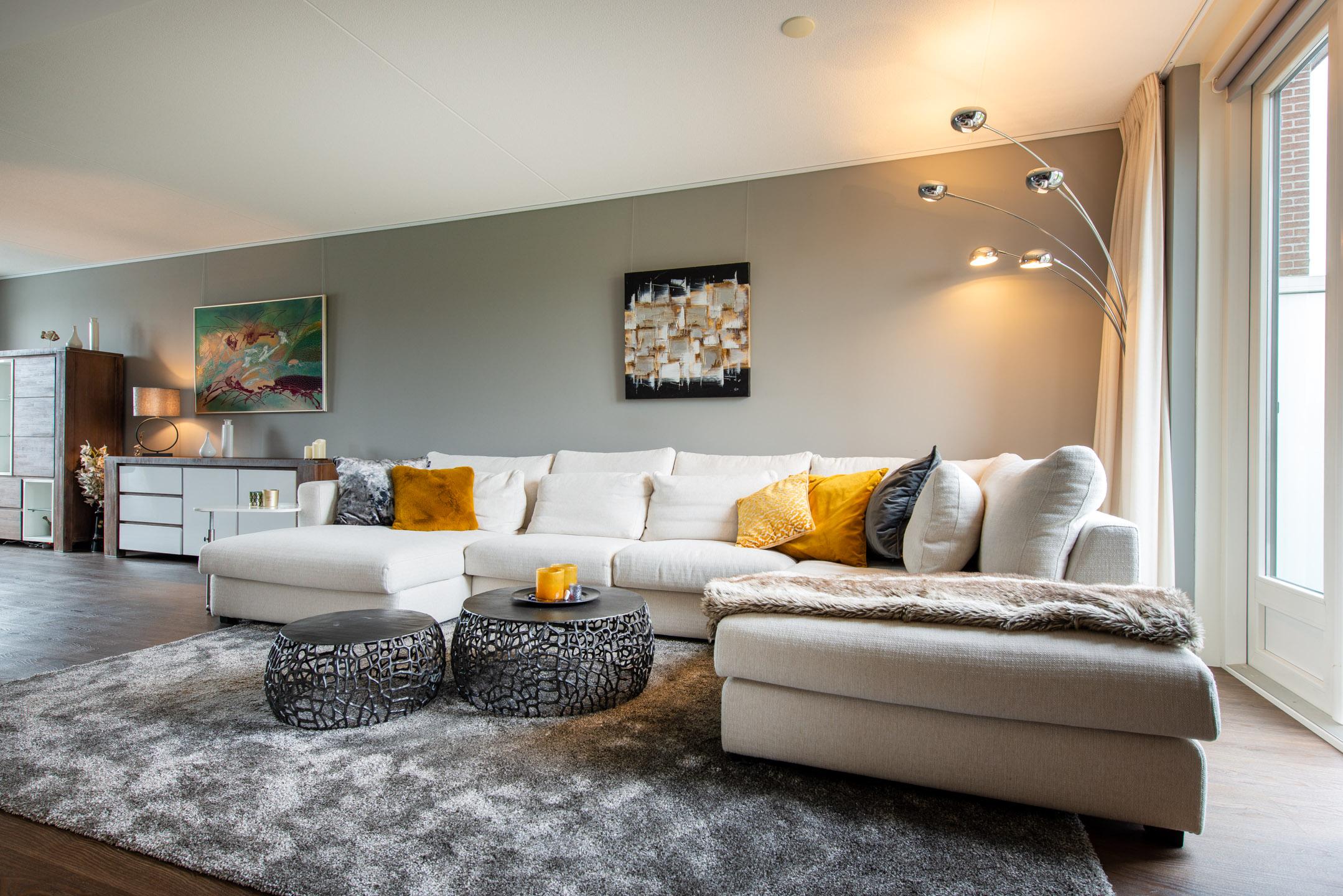 De woonkamer is afgewerkt met stucwerk wanden (geschilderd) en een wandzijde is voorzien van behang. De woonkamer (eerste verdieping) is voorzien van een PVC-vloer met vloerverwarming.