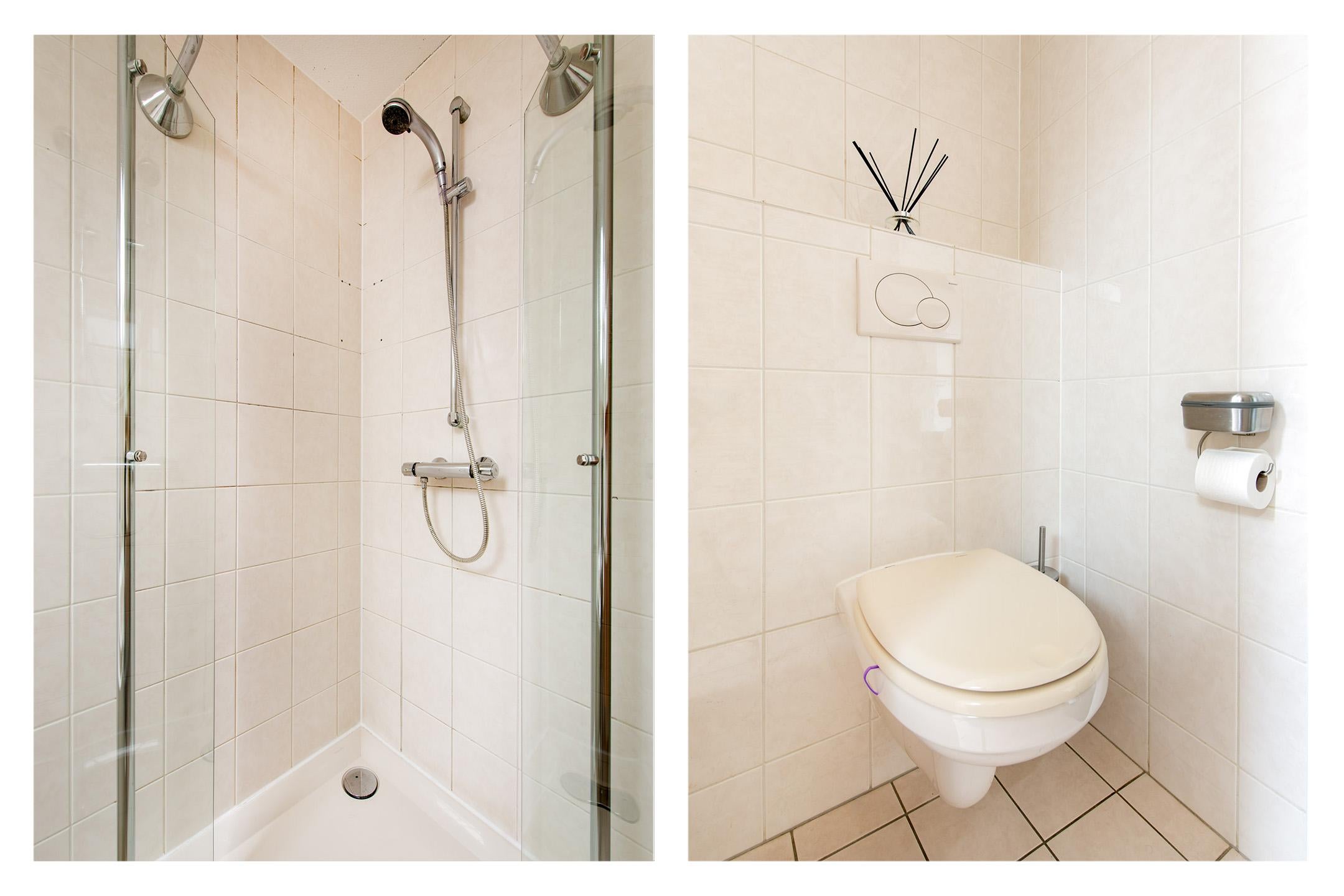 Het toilet (zwevend) beschikt over een fonteintje en mechanische ventilatie. Het plafond is voorzien van spuitwerk. De wanden zijn geheel betegeld.