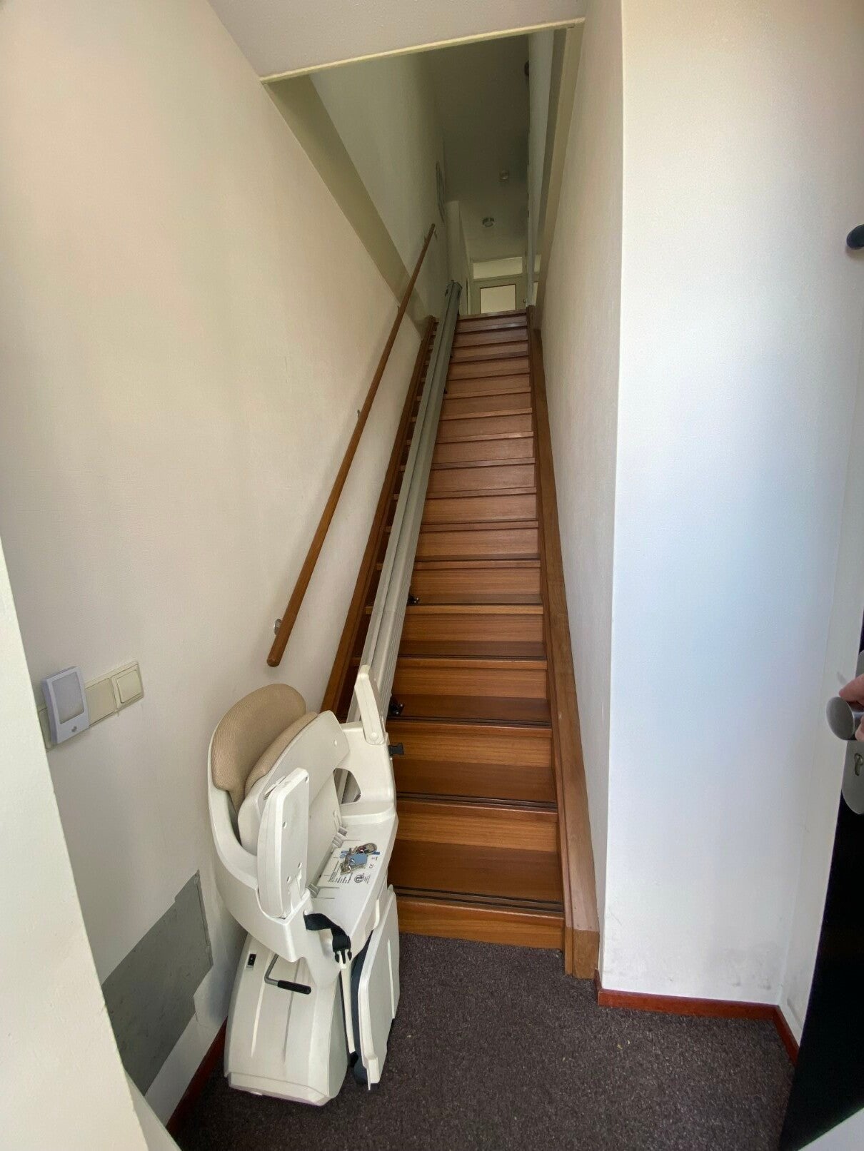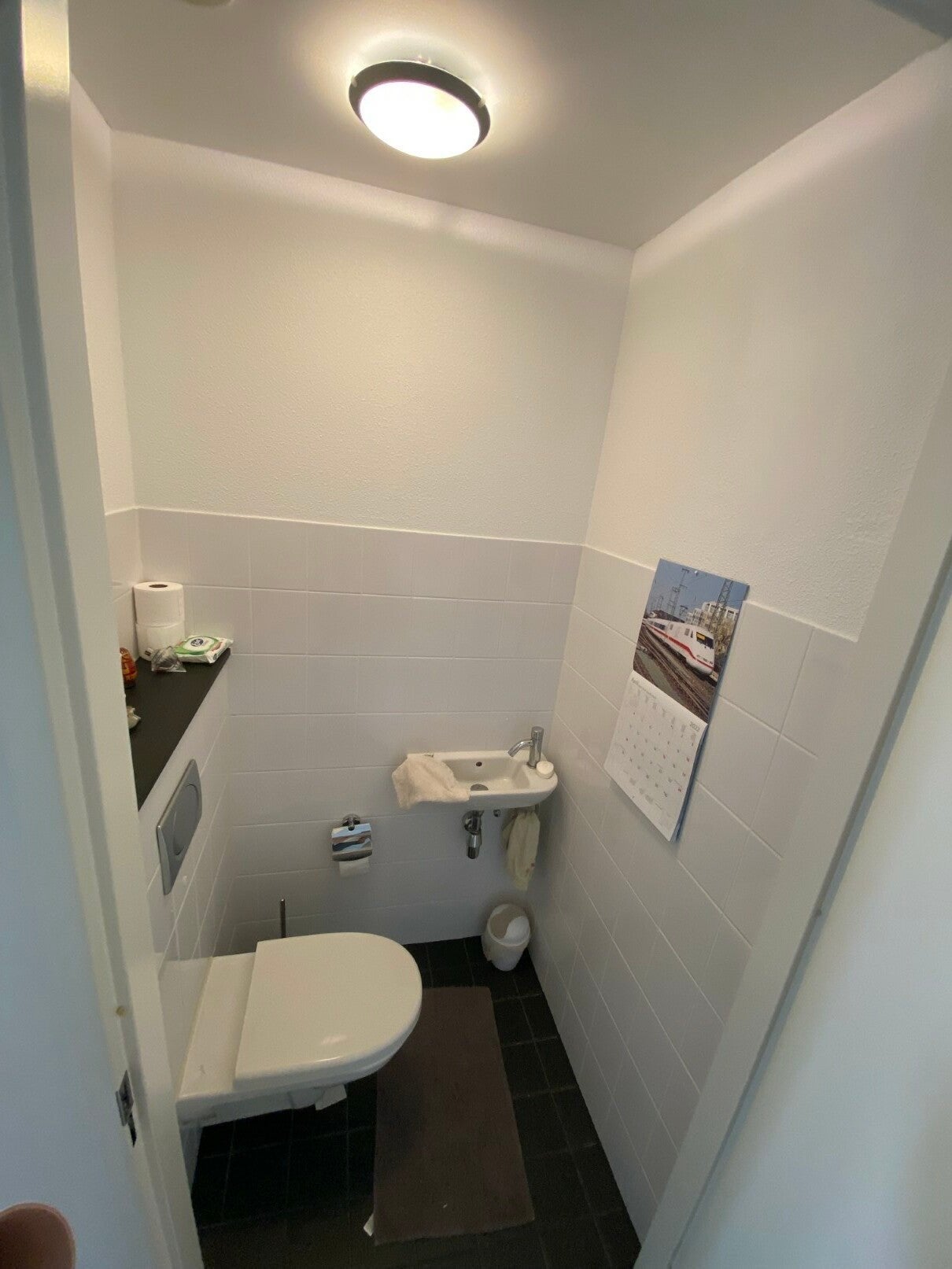 De toiletruimte is keurig afgewerkt met hangend toilet en fonteintje. De toiletruimte is deels betegeld.