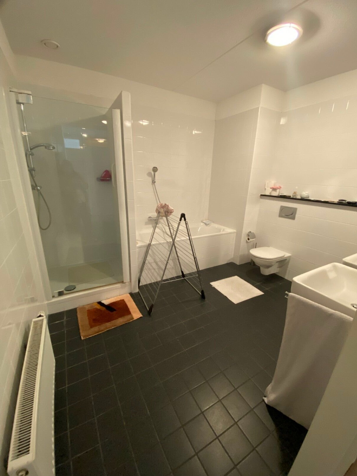 De badkamer (ca. 10 m2) is ruim opgezet en v.v. een ligbad, douche, 2e toilet en dubbele wastafel. De badkamer is nagenoeg volledig betegeld.