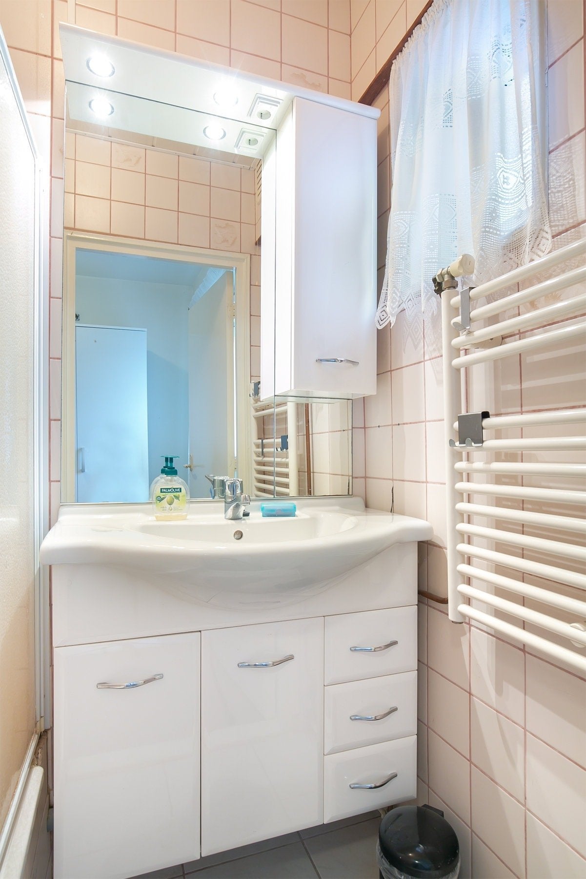 - Badkamer: bereikbaar via een aparte kamer die ook ideaal is als kantoor, opslagruimte of eventueel een derde slaapkamer. De badkamer is voorzien van douche, wastafel met meubel en handdoekenradiator.