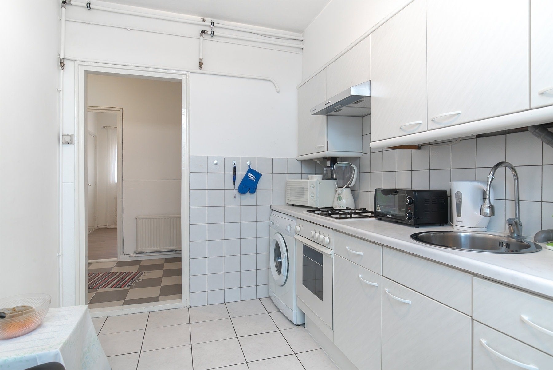 - Keuken: aan de achterzijde, voorzien van oven, gaskookplaat, afzuigunit, koelkast en wasmachine. De Cv-installatie bevindt zich in een van de bovenkasten. Vanuit de keuken bereikt u het achterbalkon.