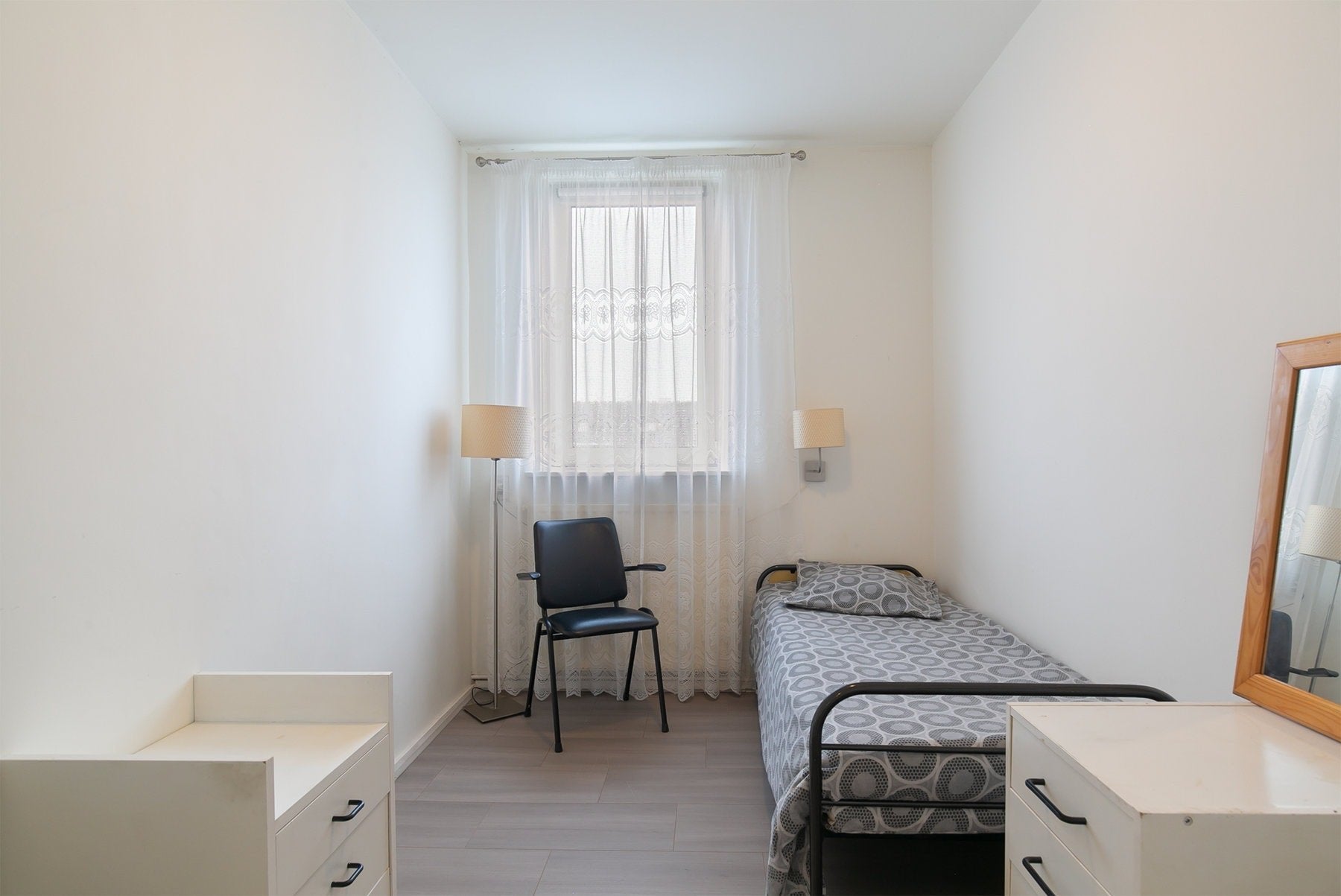 - Slaapkamer 1 (ca. 7 m²) met een eenpersoonsbed, achterzijde van het appartement.