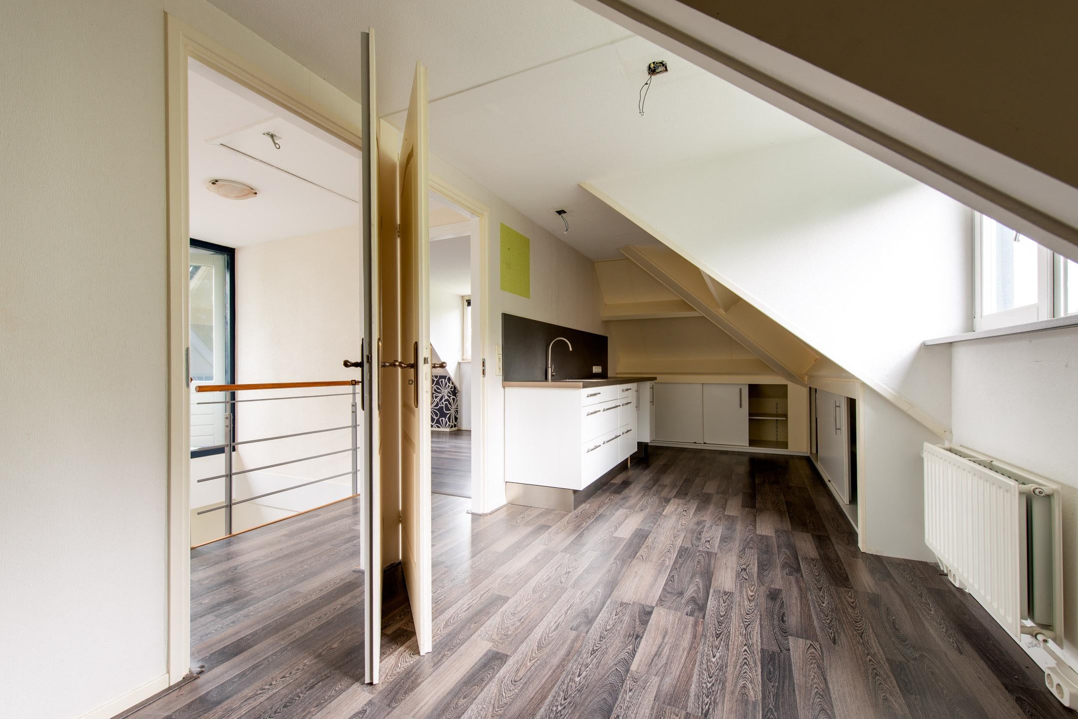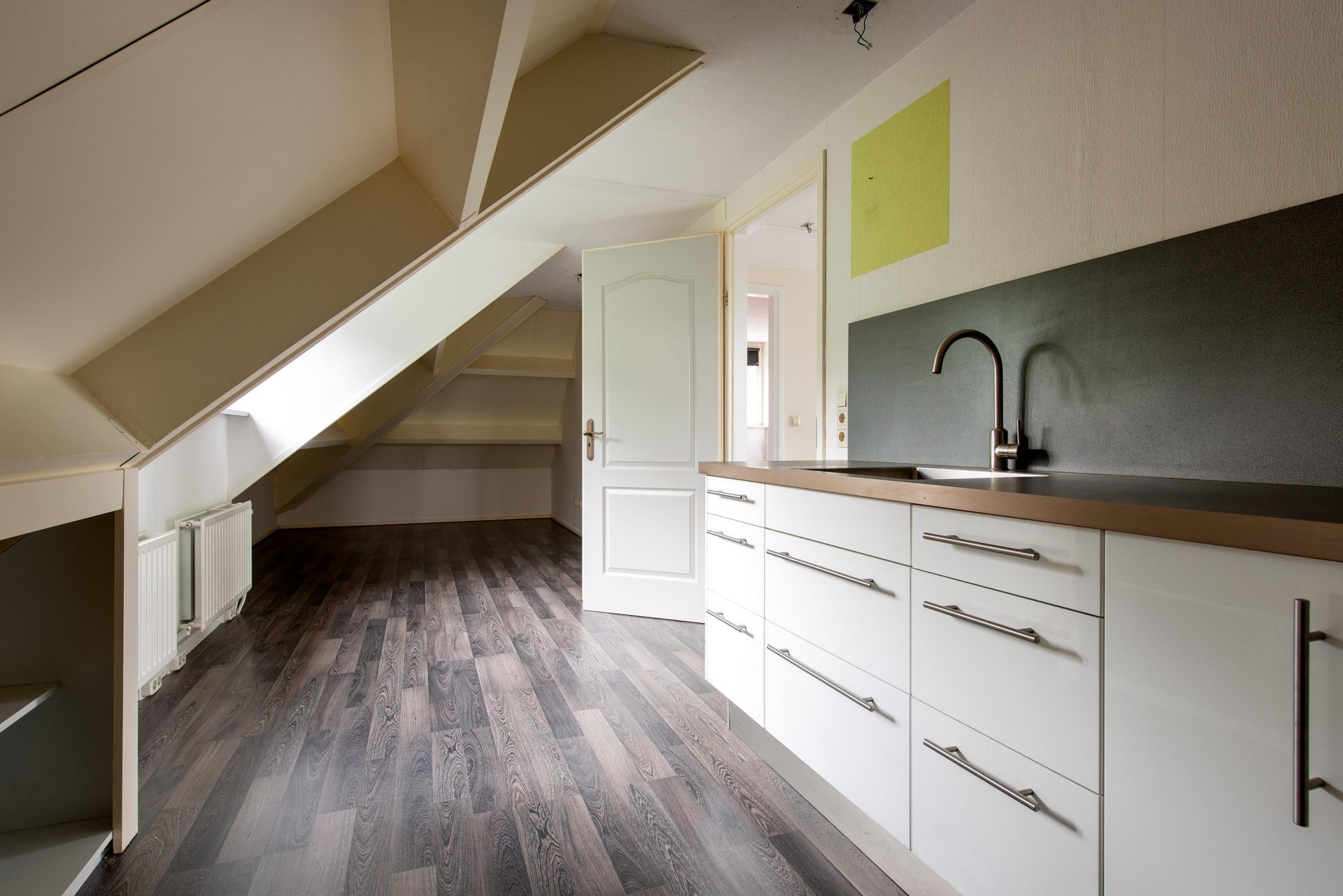 Slaapkamer 4 is gelegen aan de achterzijde en gelegen over de gehele breedte van de woning. Deze kamer is circa 25 m2 en voorzien van een dakkapel, een keukenblok zonder apparatuur maar inclusief spoelbak met mengkraan.