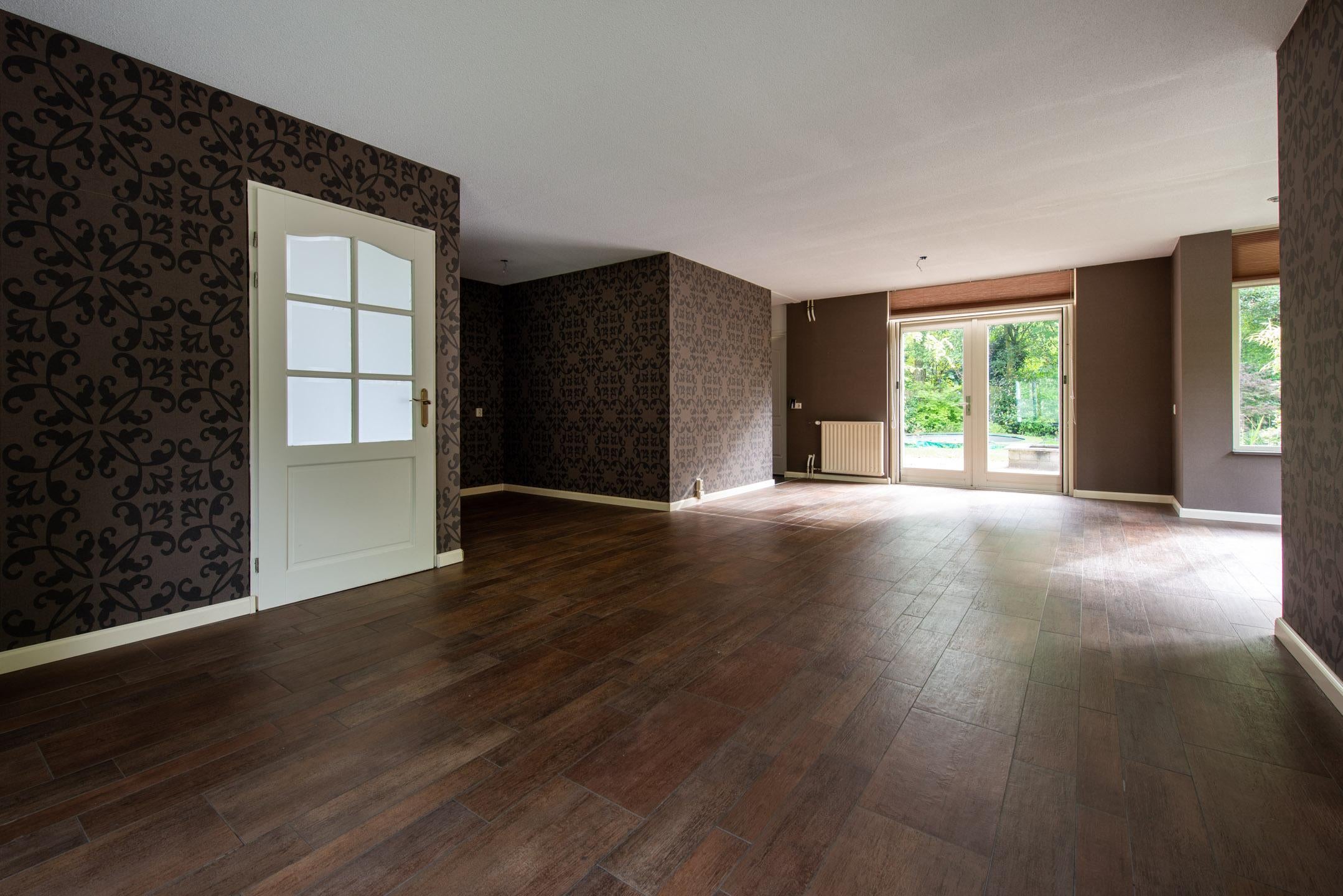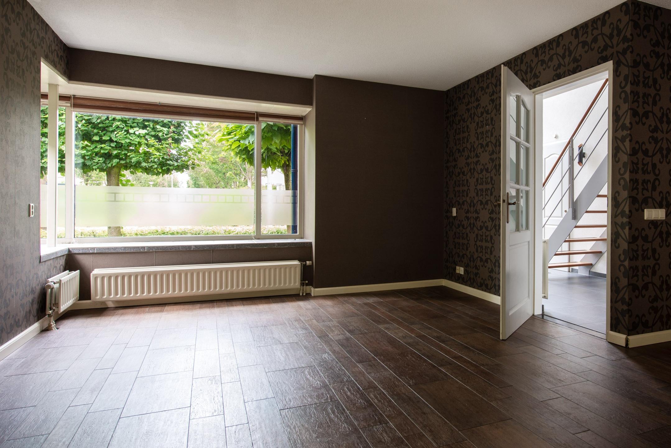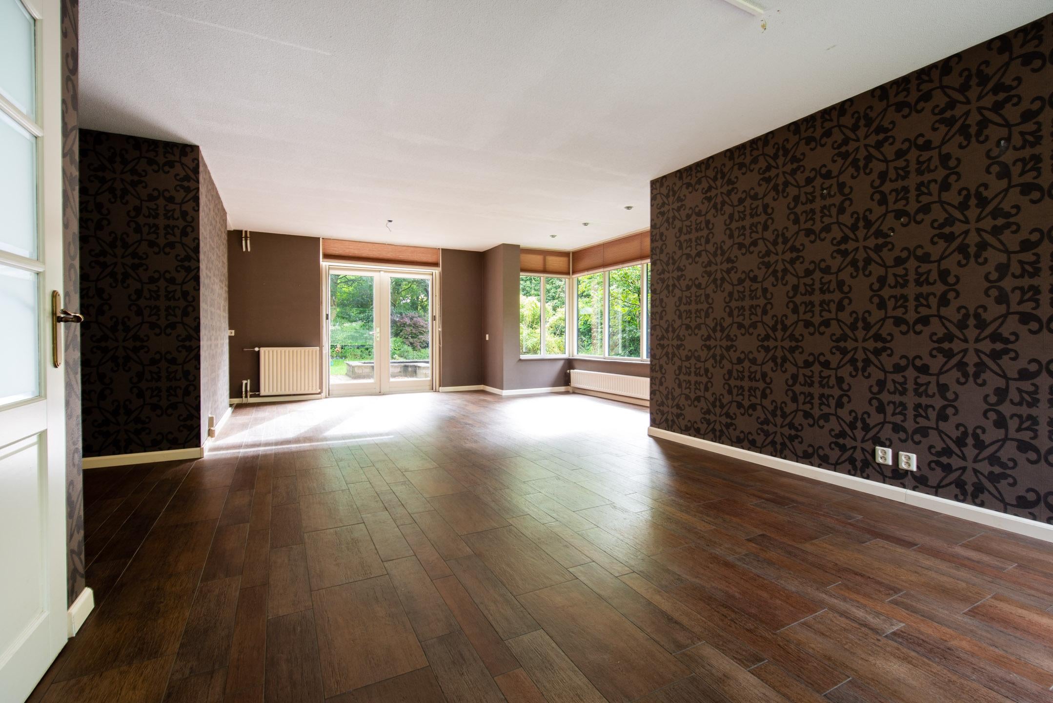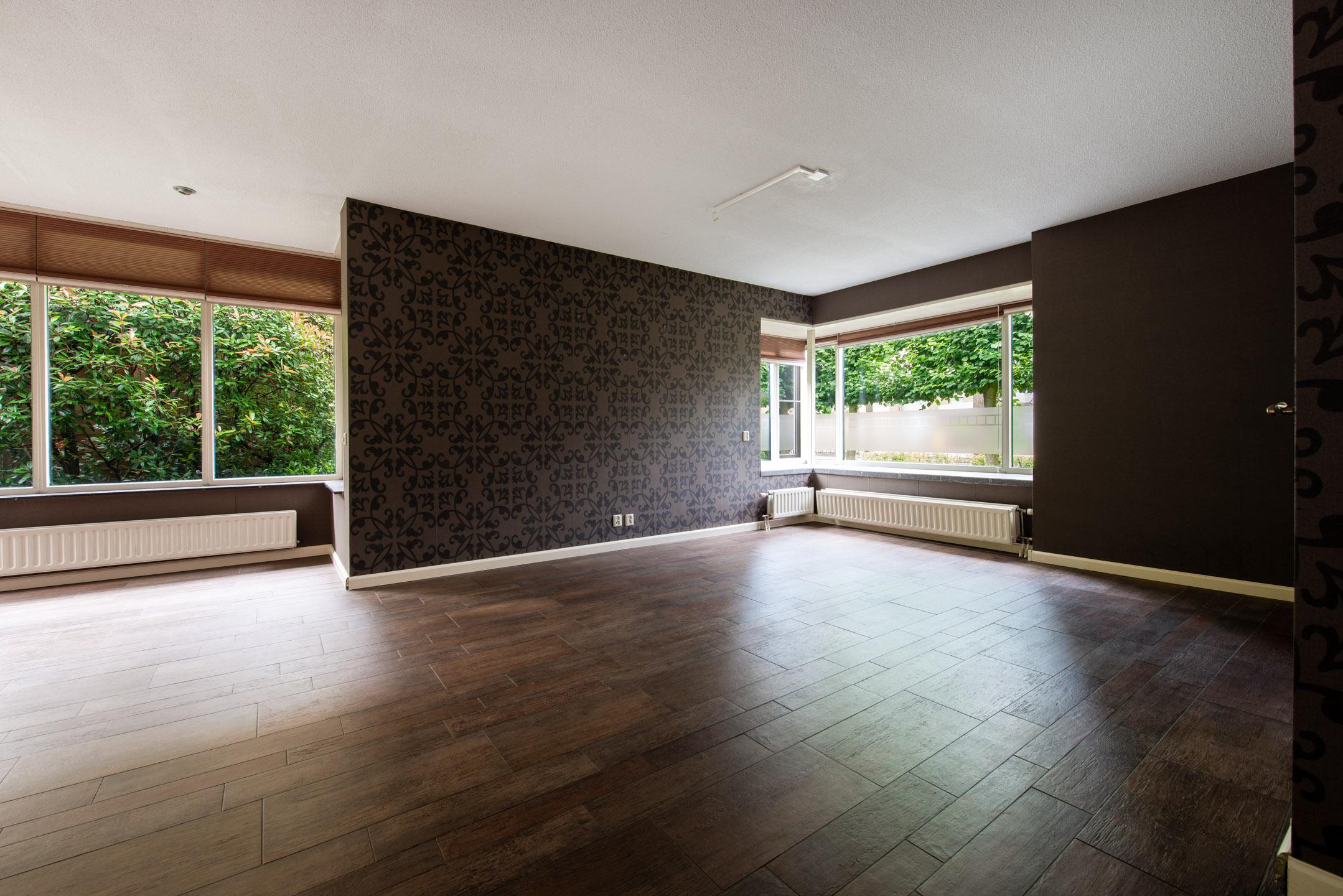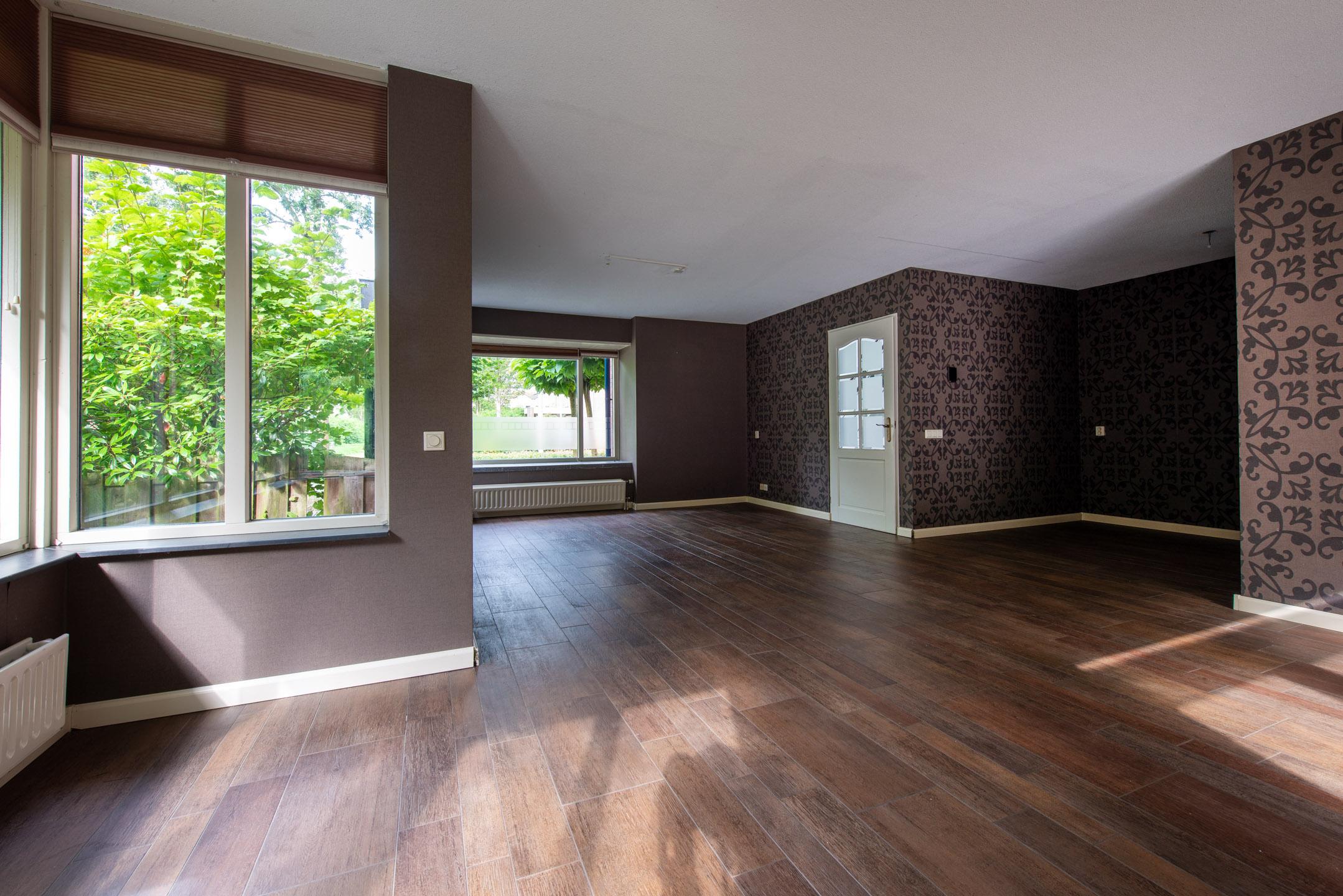 Er is een riante woonkamer aanwezig met open doorloop naar de keuken toe. Vanuit de woonkamer zijn met openslaande tuindeuren de achtertuin bereikbaar. Aan de zijkant van de woning en kamer is een uitbouw (erker) aanwezig. Door de vele raamkozijnen is er veel lichtinval in de woonkamer. De woonkamer voorzien in een plavuizenvloer met hout-look.