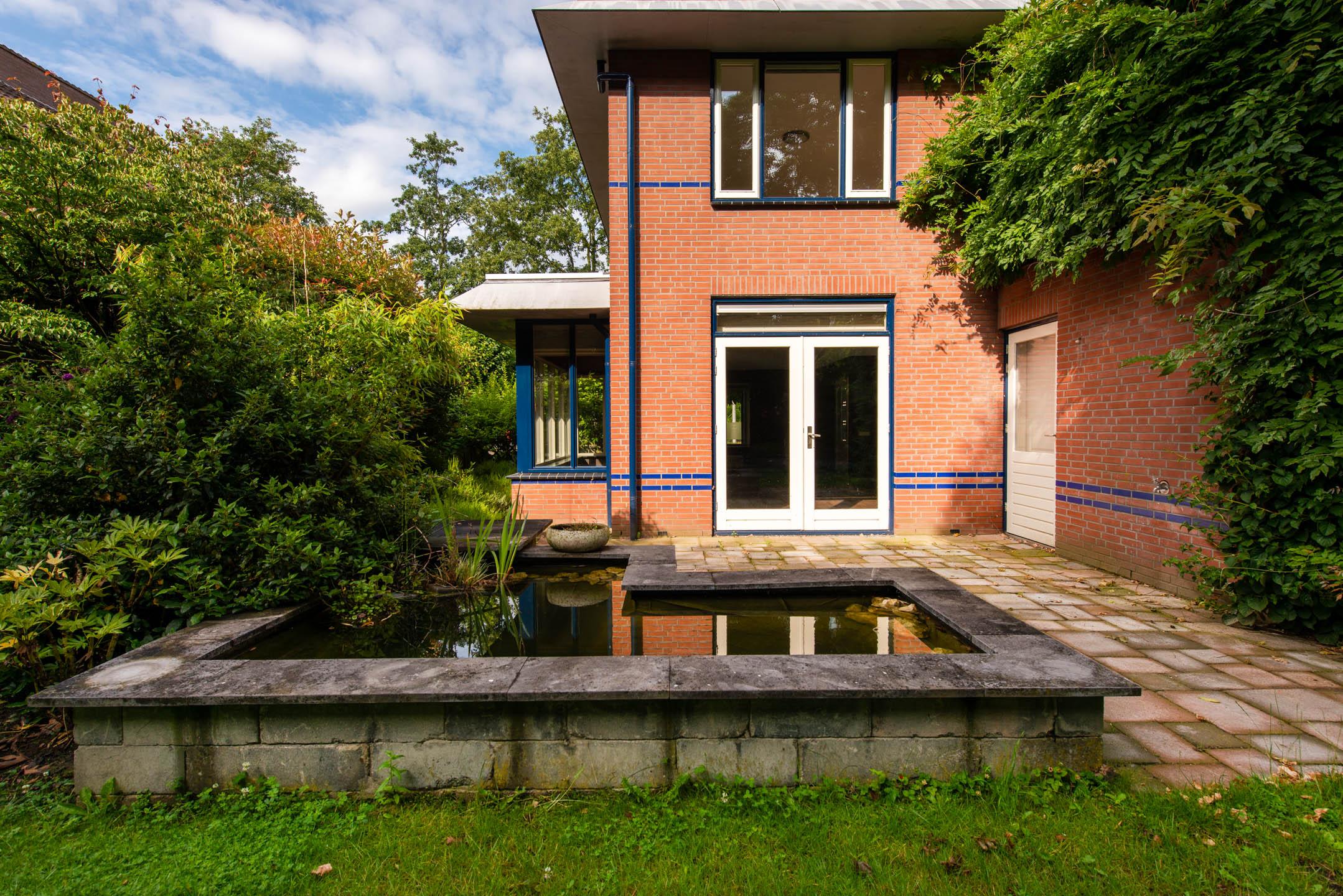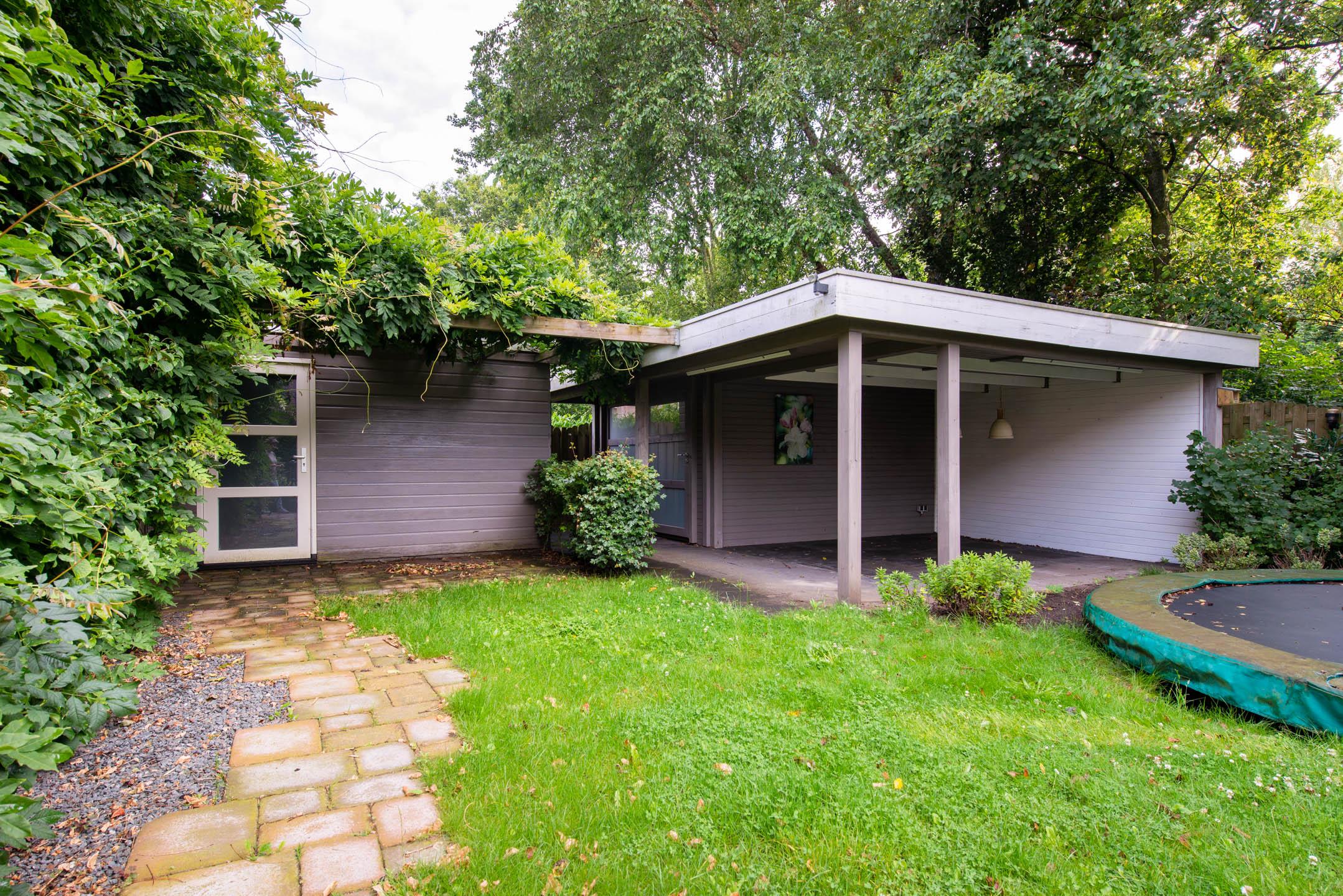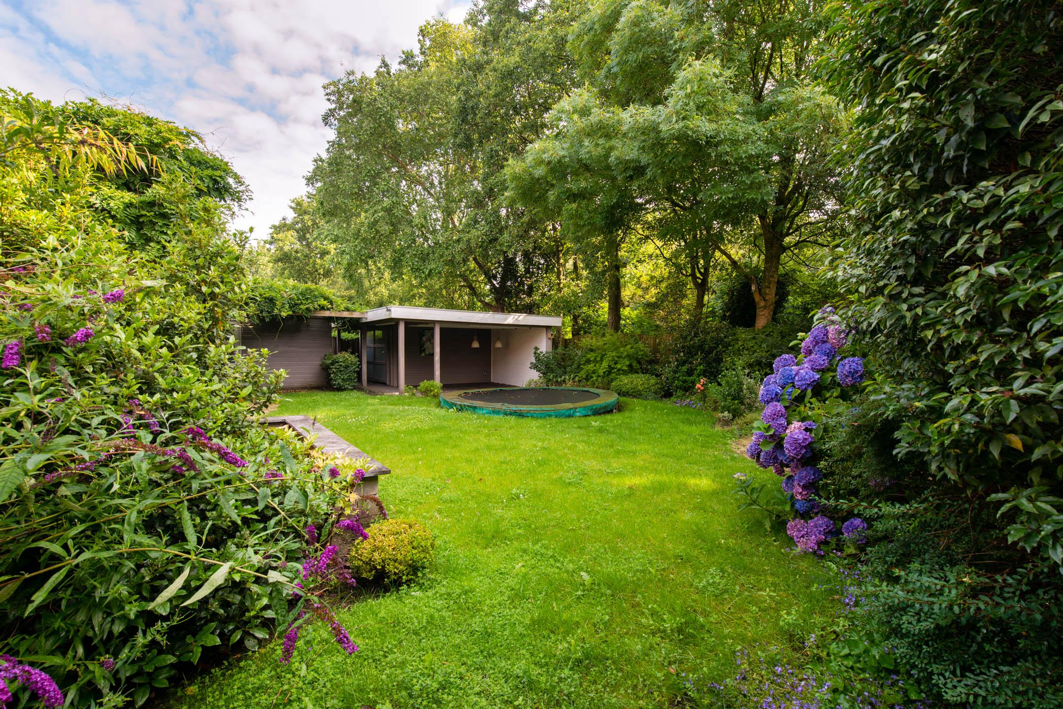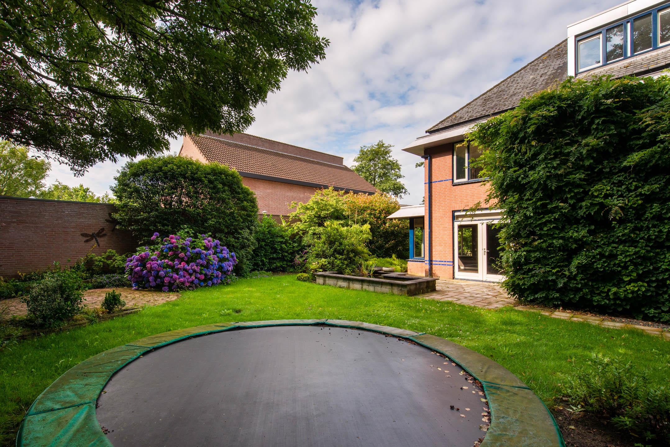 Zowel de voor-en achtertuin zijn keurig aangelegd. De achtertuin voorziet in diverse terrassen, veel groen (afwisselend van gras tot struiken en bomen), vijver, ingebouwde trampoline, houten (fietsen)berging en berging inclusief overkapping voorzien van elektra en extra groepenkast.