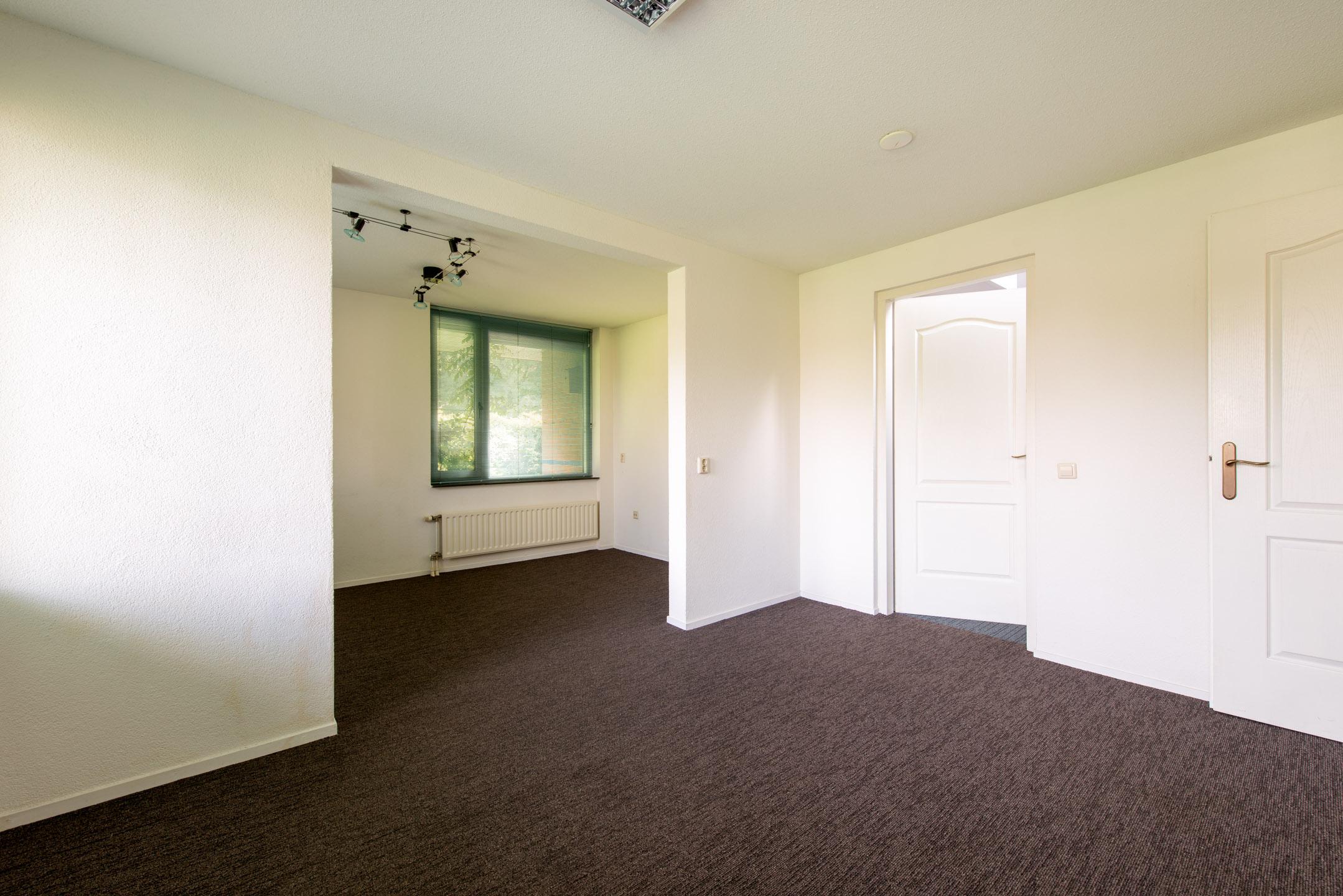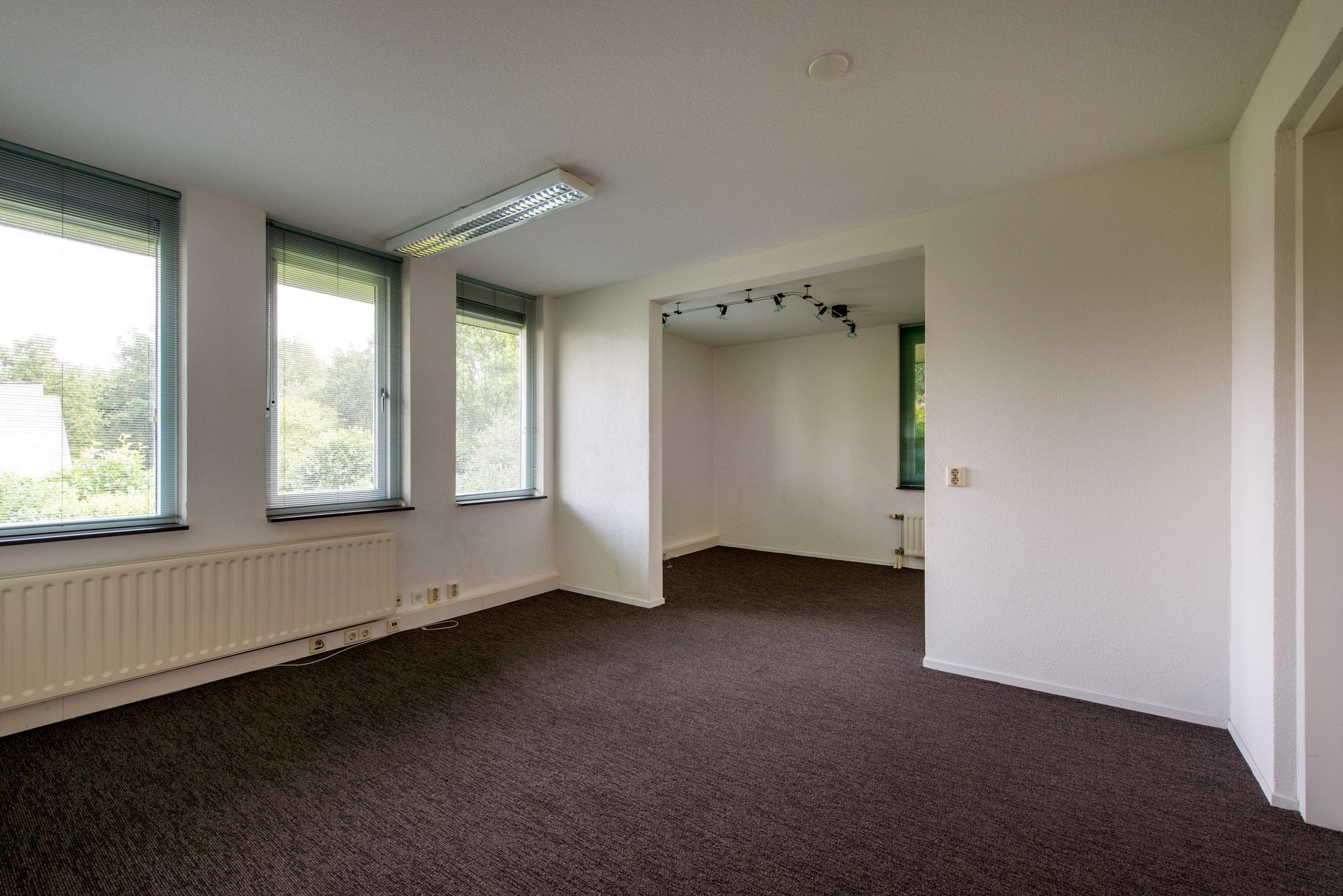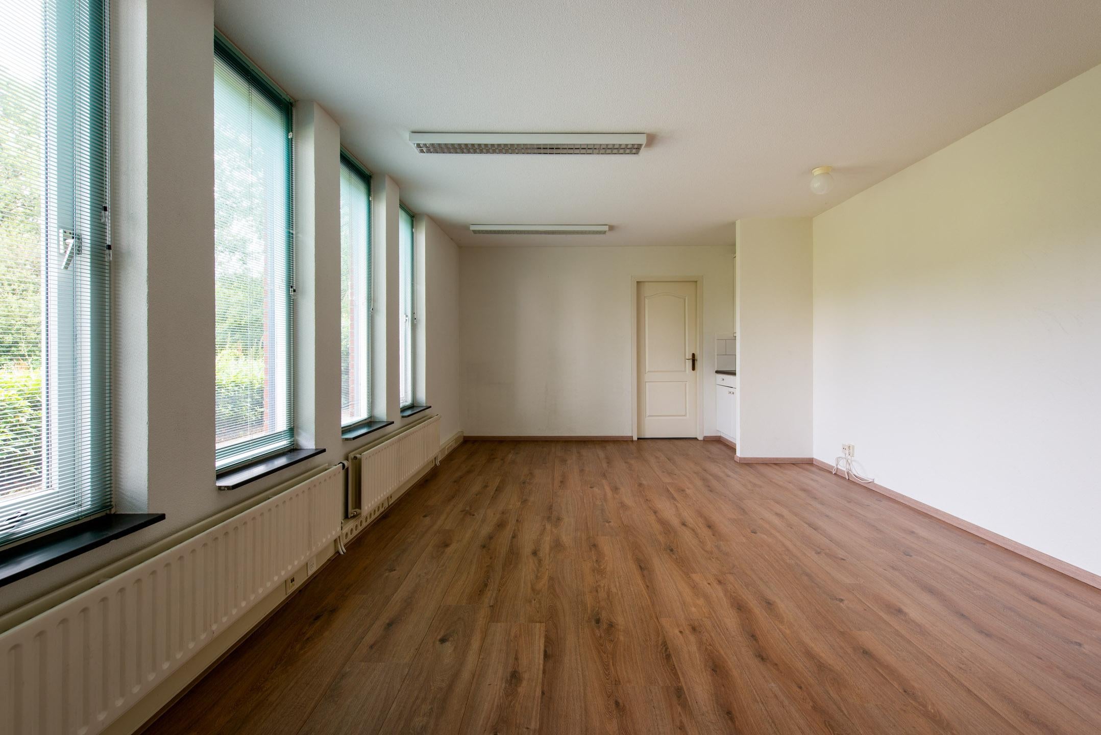 Kantoorkamer op begane grond voorzien van een keukenblok met wastafel en mengkraan. Deze kantoorkamer biedt voldoende ruimte voor meerdere werkplekken. Deze ruimte is circa 26 m2.