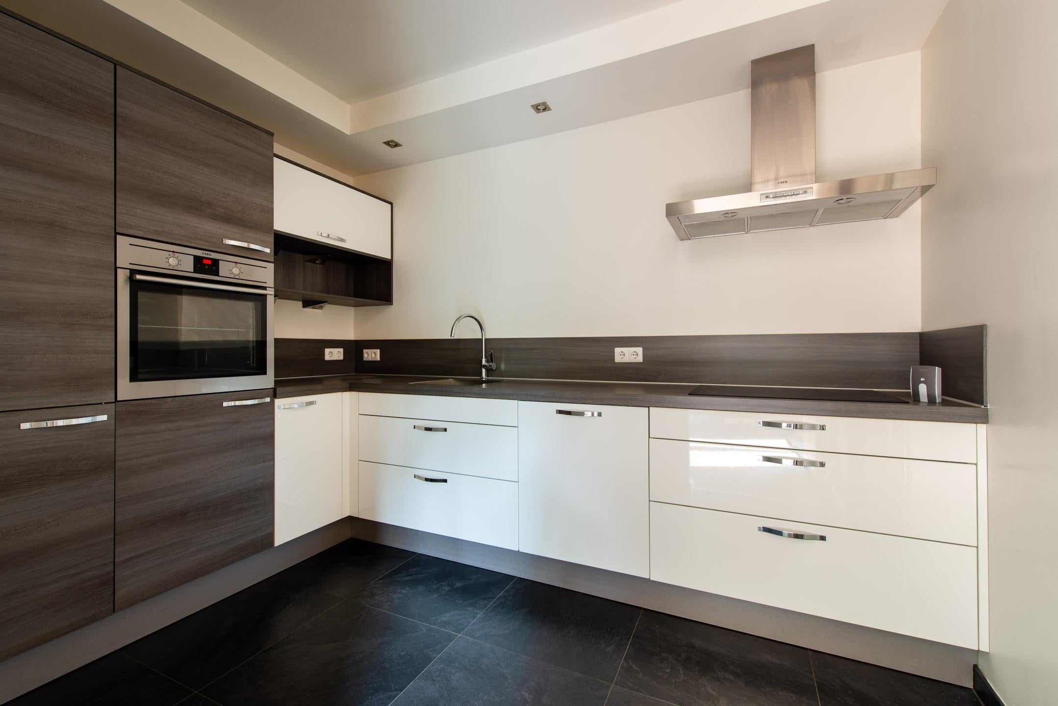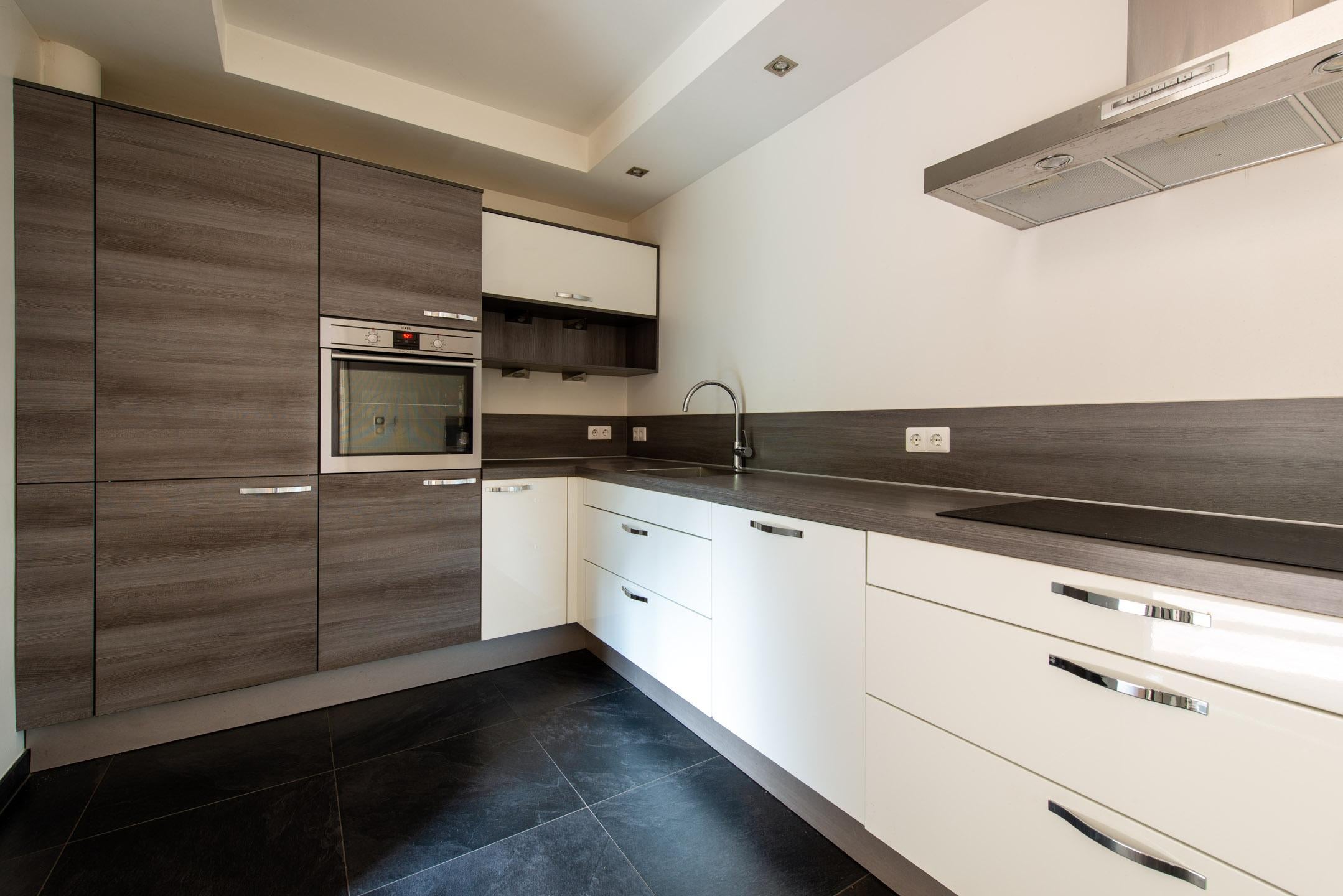De keuken (L-vormige opstelling) met ruim werkblad, inductiekookplaat, afzuiginstallatie, vaatwasser, oven en koel-vriescombinatie. De keuken is afgewerkt met een tegelvloer en inbouwpots.