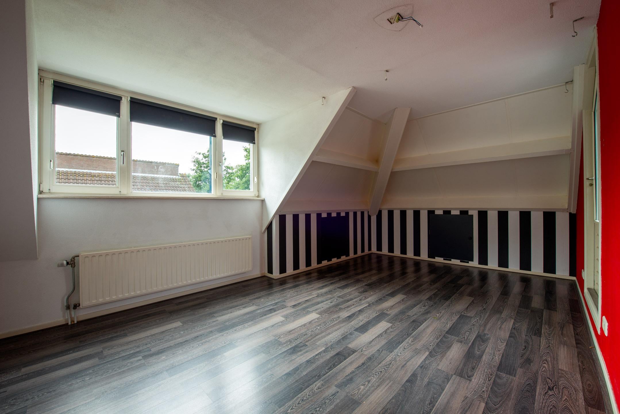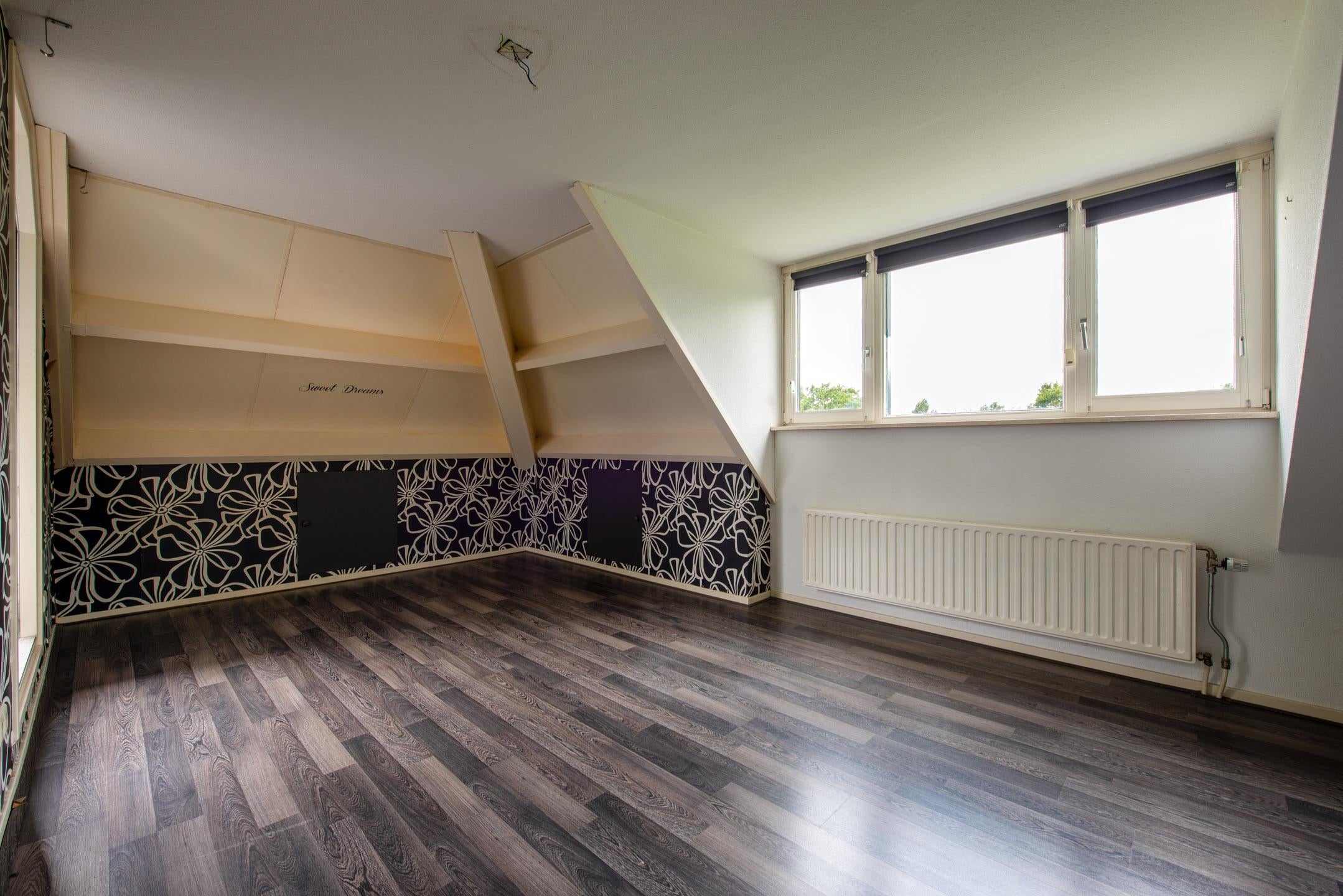 Deze slaapkamer is voorzien van een grijze laminaatvloer en bergkasten in de knieschotten.