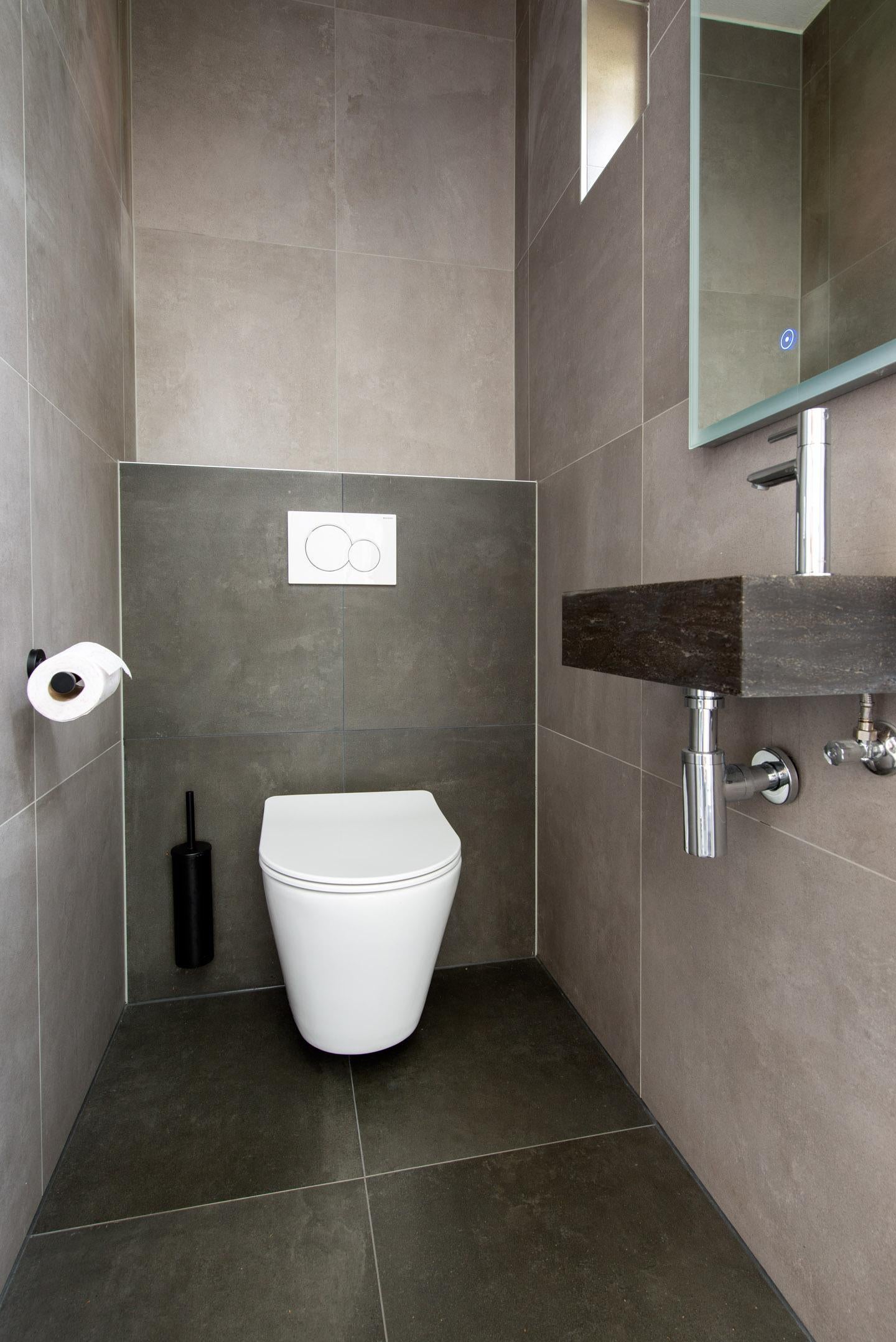 Een keurig afgewerkte toiletruimte met een hangend closet, fonteintje en spiegel inclusief verlichting. De toiletruimte is volledig betegeld.