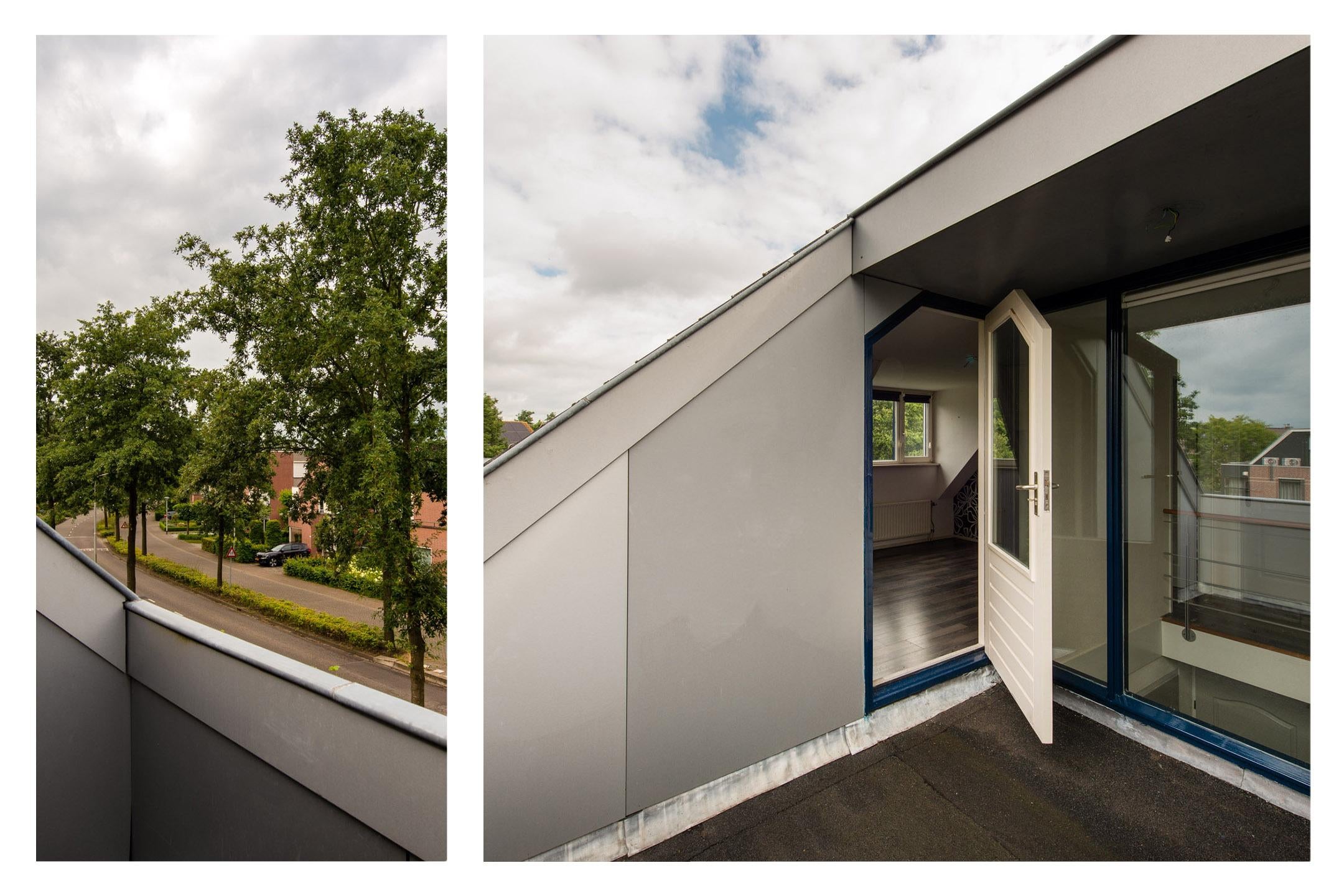 Slaapkamer 5 en Slaapkamer 6 zijn spiegelbeeld van elkaar. Beide kamers hebben een directe toegang naar het dakterras aan de voorzijde van de woning. De slaapkamers zijn circa 15 m2, voorzien van een grijze laminaatvloer en bergkasten in de knieschotten.