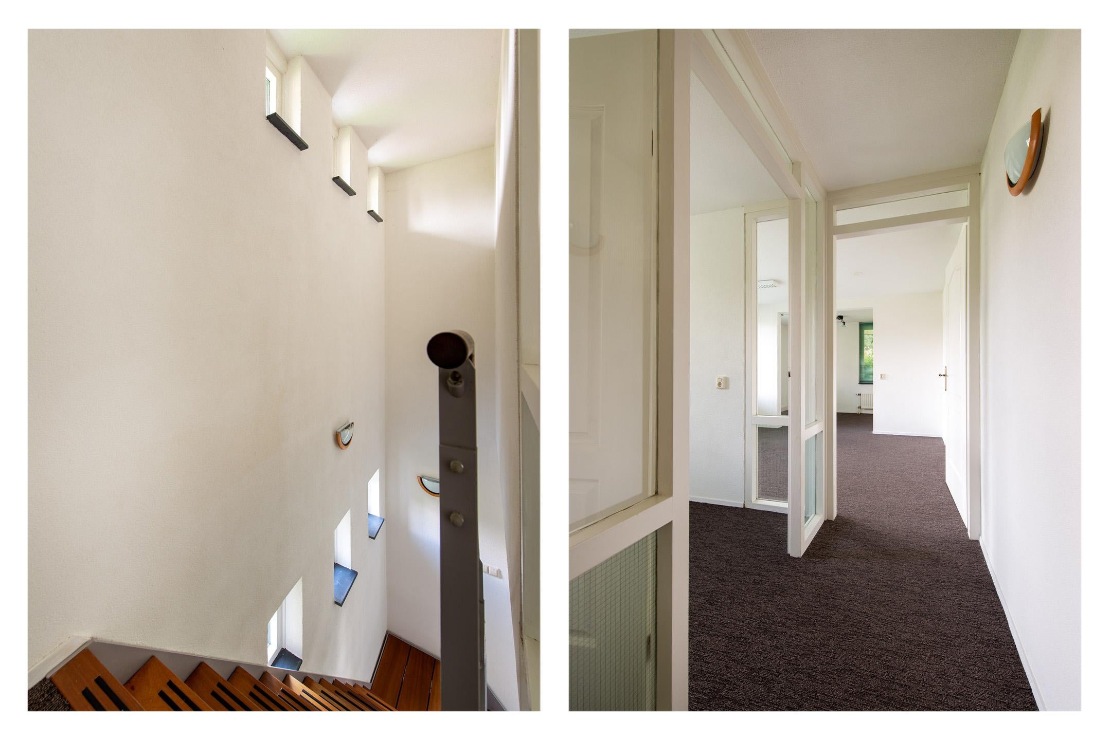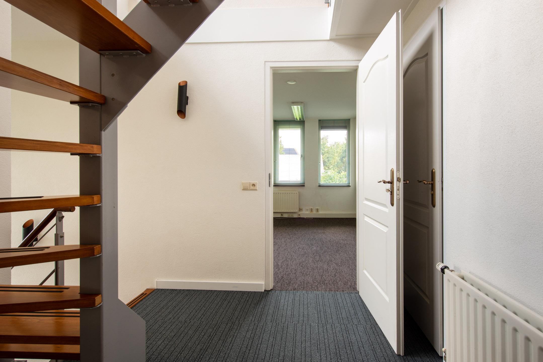 Middels een vaste trap is de verdieping bereikbaar. Via een kleine overloop bereikt u nog twee kantoorkamers. Een kleine kamer van circa 6 m2 en een grote ruimte van circa 22 m2. Indien gewenst is de grote kamer op te splitsten in 2-3 kleine kantoorkamers.