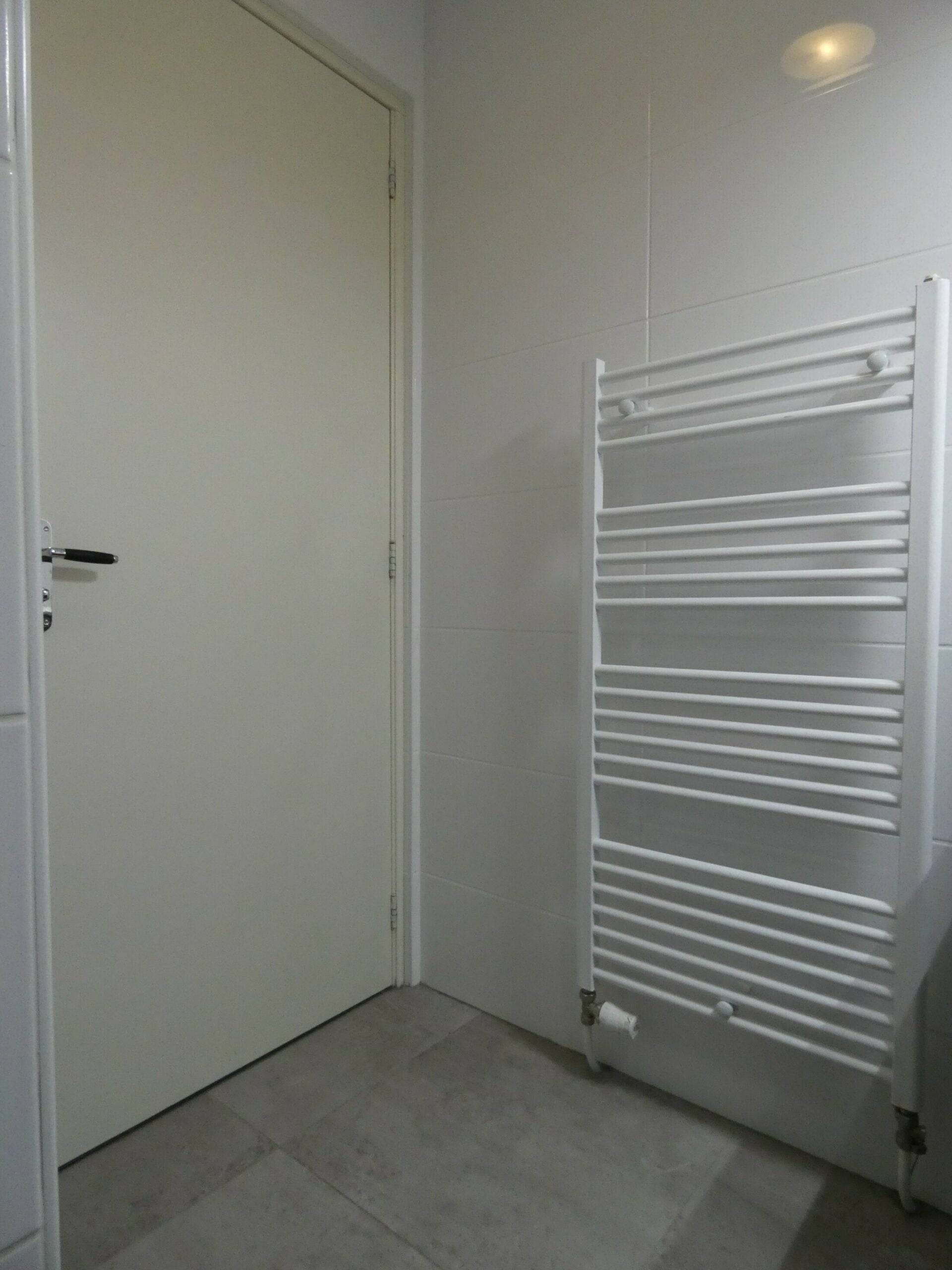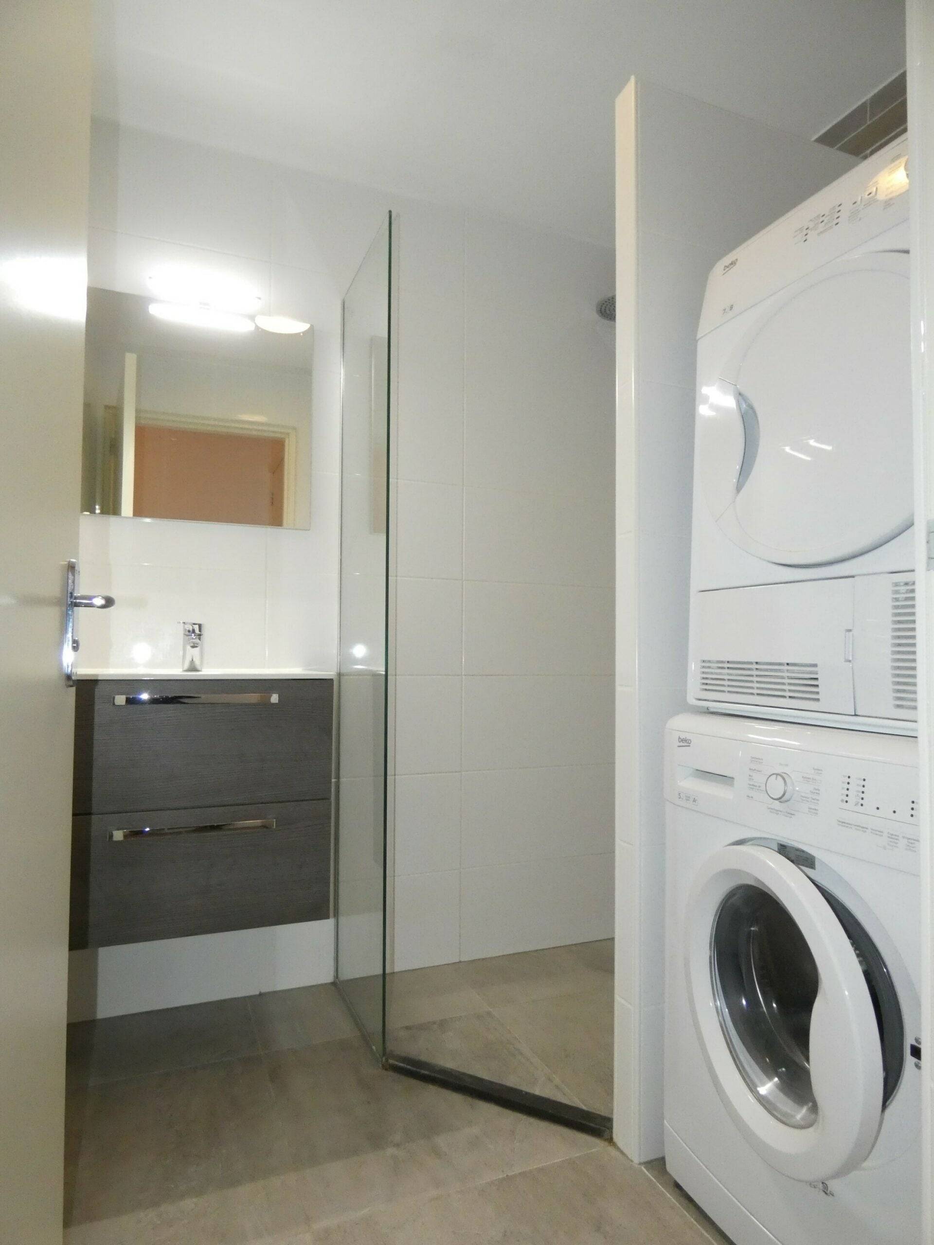 De badkamer is v.v. een inloopdouche, design radiator, wastafel inclusief meubel en een wasmachine + droger. De badkamer is compact maar heeft een logische indeling.